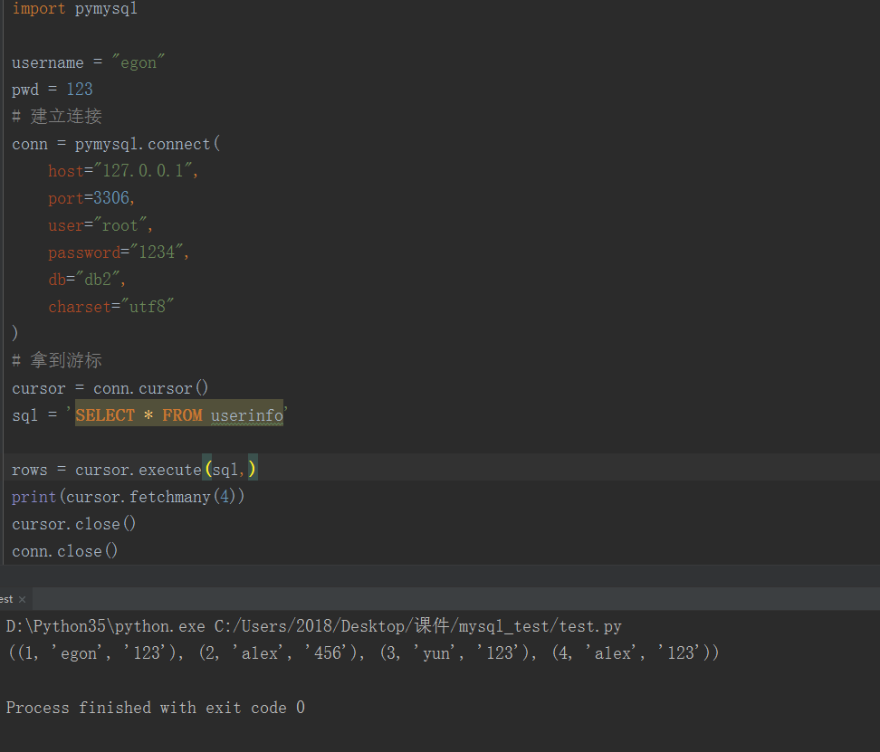 import pymysql user="egon16" pwd= 123 #先链接,拿到游标 conn=pymysql.connect(host='localhost',user='root',password='1234', database='ls',charset='utf8') cursor=conn.cursor() sql='select * from stu;' rows = cursor.execute(sql)