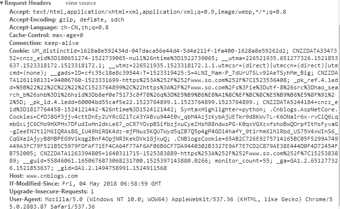 1、Host 请求的web服务器域名地址 2、User-Agent HTTP客户端运行的浏览器类型的详细信息。 通过该头部信息,web服务器可以判断出http请求的客户端的浏览器的类型。 3、Accept 指定客户端能够接收的内容类型,内容类型的先后次序表示客户都接收的先后次序 4、Accept-Lanuage 指定HTTP客户端浏览器用来展示返回信息优先选择的语言 5、Accept-Encoding 指定客户端浏览器可以支持的web服务器返回内容压缩编码类型。表示允许服务器在将输出内容发送到客户端 以前进行压缩,以节约带宽。而这里设置的就是客户端浏览器所能够支持的返回压缩格式。 6、Accept-Charset HTTP客户端浏览器可以接受的字符编码集 7、Content-Type 显示此HTTP请求提交的内容类型。一般只有post提交时才需要设置该属性 有关Content-Type属性值有如下两种编码类型: (1)“application/x-www-form-urlencoded”: 表单数据向服务器提交时所采用的编码类型, 默认的缺省值就是“application/x-www-form-urlencoded”。 然而,在向服务器发送大量的文本、包含非ASCII字符的文本或二进制数据时这种编码方式效率很低。 (2)“multipart/form-data”: 在文件上载时,所使用的编码类型应当是“multipart/form-data”, 它既可以发送文本数据,也支持二进制数据上载。 当提交为表单数据时,可以使用“application/x-www-form-urlencoded”;当提交的是文件时, 就需要使用“multipart/form-data”编码类型。 8、Keep-Alive 表示是否需要持久连接。如果web服务器端看到这里的值为“Keep-Alive”,或者看到请求使用的是HTTP 1.1 (HTTP 1.1默认进行持久连接),它就可以利用持久连接的优点