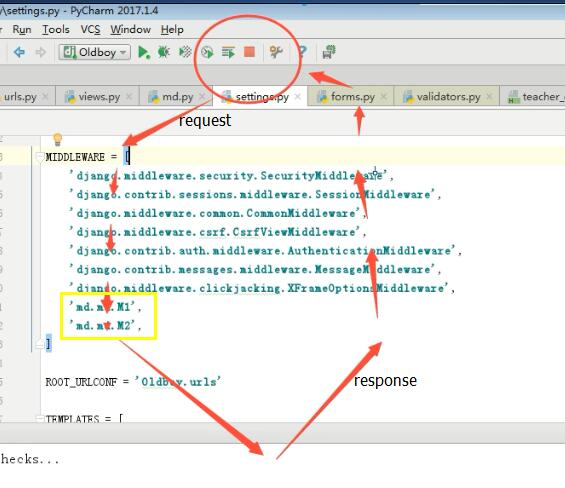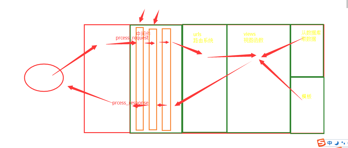 步骤: 1、、先建一个文件夹,里面写一个py文件 2、、然后开始写类 1.中间件就是一个类,类里面写几个方法 class M1(MiddlewareMixin): 必须继承 def process_request(self,request): request:请求里面的所有的东西 print("m1.request_request") 这个方法里面别轻易返回值,要是有返回值就不再继续执行后面的了,执行自己的process_response和上边的response 一般是无返回值的:继续执行后续的中间件和视图函数 def process_response(self,request,response): return response 2.在settings中的MIDDLEWARE加上路径 文件夹名称.py文件名称.类名 3.找到继承的那个类,吧那个类拿过来 一般不要用导入的方法,不然有时候更新了就没有这个类了,你就把它继承的那个类拿过来,
