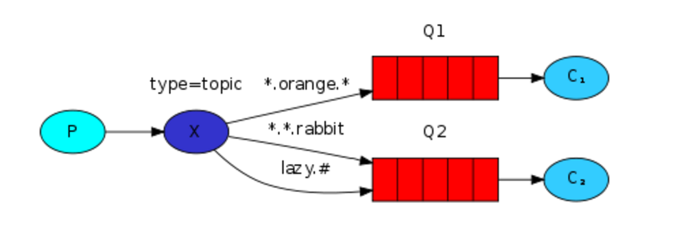 在topic类型下,可以让队列绑定几个模糊的关键字,之后发送者将数据发送到exchange,exchange将传入”路由值“和 ”关键字“进行匹配,匹配成功,则将数据发送到指定队列。