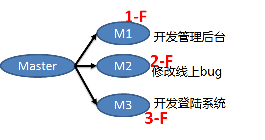 具体的来说,如图下所示,当前从master之后又三个分支,分别是1-F,2-F,3-F,对应的不同的工作内容。我前段时间就经常游走于这样的一个工作场景中: