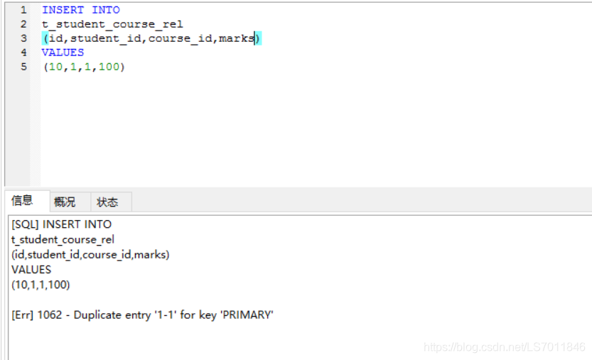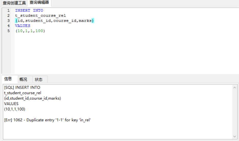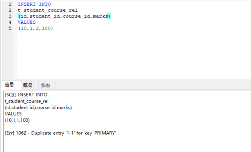 表中已经有了student_id=1和course_id=1的数据,如果再插入便会报错。