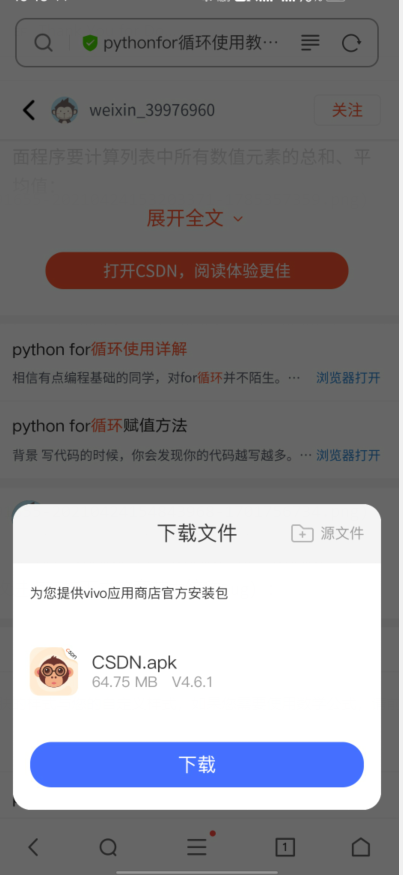 下载好csdn app,进入浏览器搜索一篇csdn博客,打开博客,点击app内打开,试了两个浏览器都会这样。