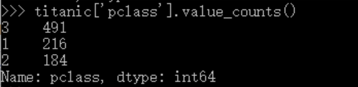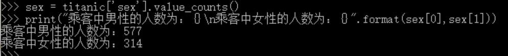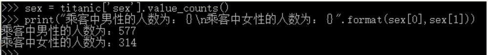>>> sex = titanic['sex'].value_counts() >>> print("乘客中男性的人数为:{}\n乘客中女性的人数为:{}".format(sex[0],sex[1]))