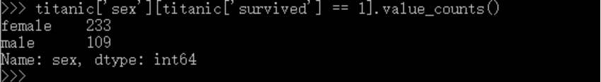 >>> titanic['sex'][titanic['survived'] == 1].value_counts()