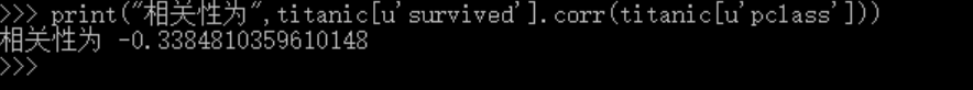 >>> print("相关性为",titanic[u'survived'].corr(titanic[u'pclass']))
