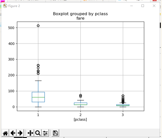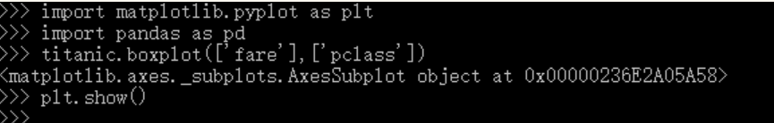 >>>import matplotlib.pyplot as plt >>>import pandas as pd >>>titanic.boxplot(['fare'],['pclass']) >>>plt.show()