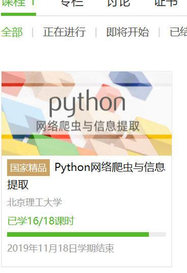 这两周使用mooc学习了由北京理工大学开课的Python网络爬虫与信息提取课程,通过学习这门课程让我对python有了新的认识,在本次学习中主要学习了Python第三方库Requests,是一个可以通过HTTP/HTTPS协议自动从互联网获取数据并向其提交请求的方法; Python第三方库Beautiful Soup,讲解了从所爬取HTML页面中解析完整Web信息的方法;Python标准库Re,讲解了从所爬取HTML页面中提取关键信息的方法;Python第三方库Scrapy,介绍通过网络爬虫框架构造专业网络爬虫的基本方法。以及围绕网络爬虫的工程伦理及其他技术内容。