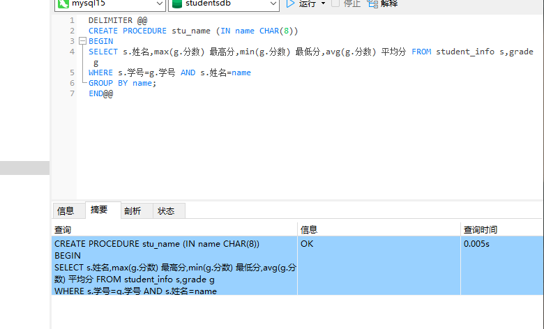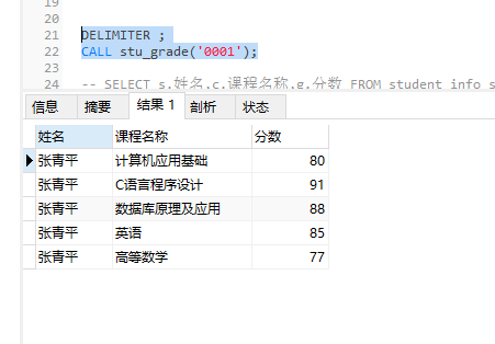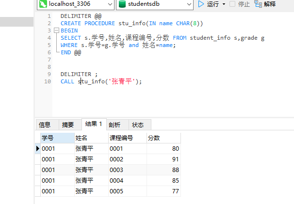 1.输入以下代码,创建存储过程stu_info,执行时通过输入姓名,可以查询该姓名的学生的各科成绩。