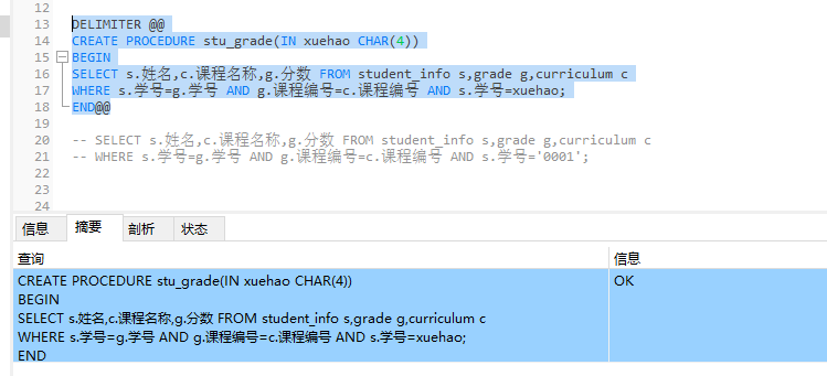 CREATE PROCEDURE stu_grade(IN xuehao CHAR(4))