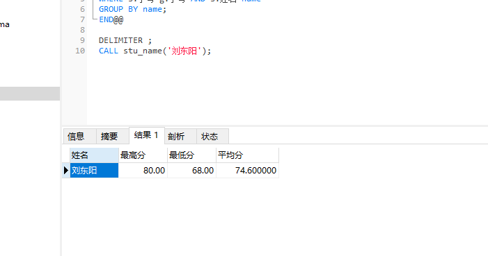(1)创建存储过程stu_name,当任意输入一个学生的姓名时,查看其课程的最高分、最低分、平均分。