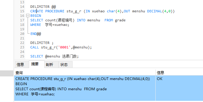 CREATE PROCEDURE stu_g_r (IN xuehao char(4),OUT menshu DECIMAL(4,0))