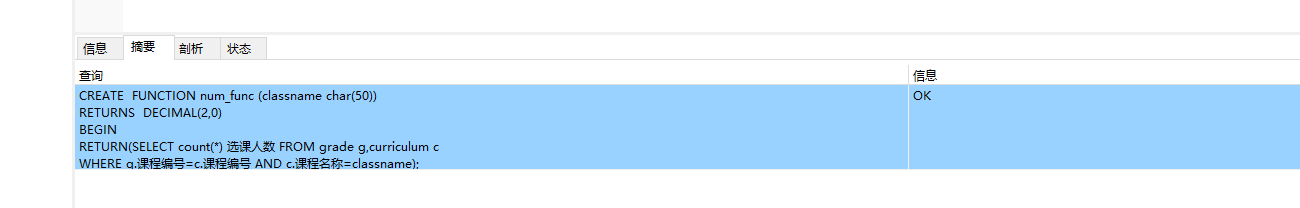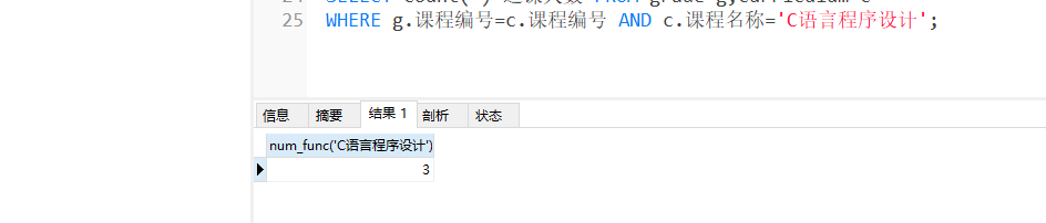 (2)执行存储函数num_func,查看“C语言程序设计”选课人数。