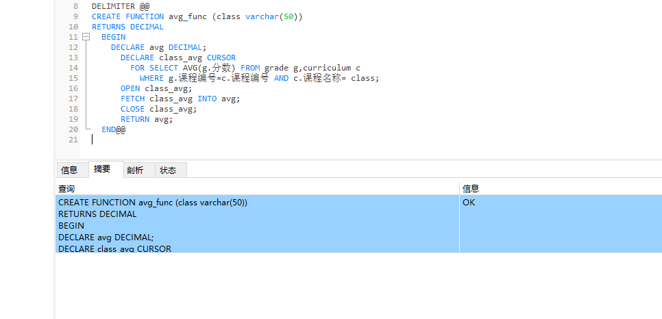 (1)创建一个存储函数avg_func,通过游标统计指定课程的平均分。
