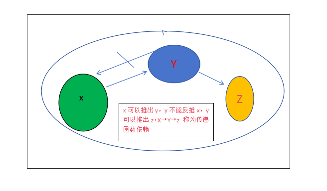 定义:设R是一个具有属性集合U的关系模式,X、Y、Z是U的子集,且X、Y、Z是不同的属性集。如果X→Y,Y→X不成立,Y→Z,则称Z传递函数依赖于X,记作
