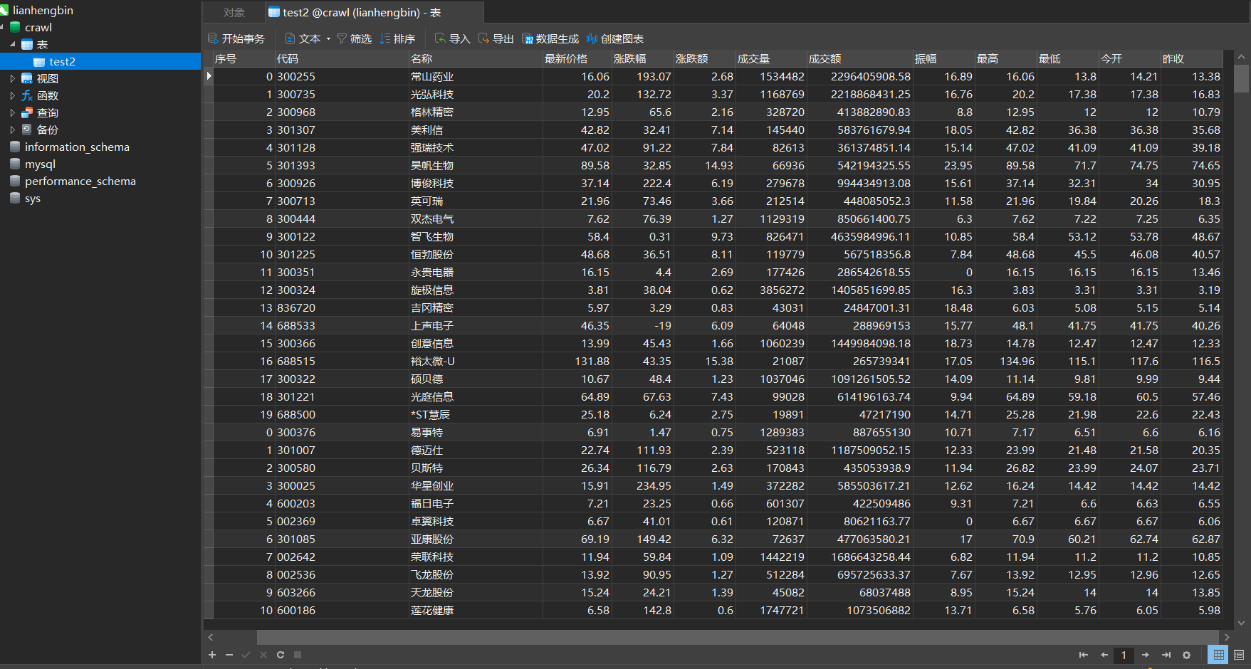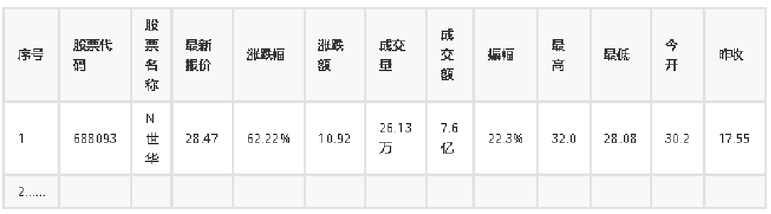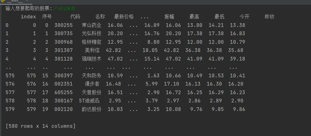 columns = {0:"序号",1:"代码",2:'名称',3:"最新价格",4:"涨跌幅",5:"涨跌额",6:"成交量",7:"成交额",8:"振幅",9:"最高",10:"最低",11:"今开",12:"昨收"}