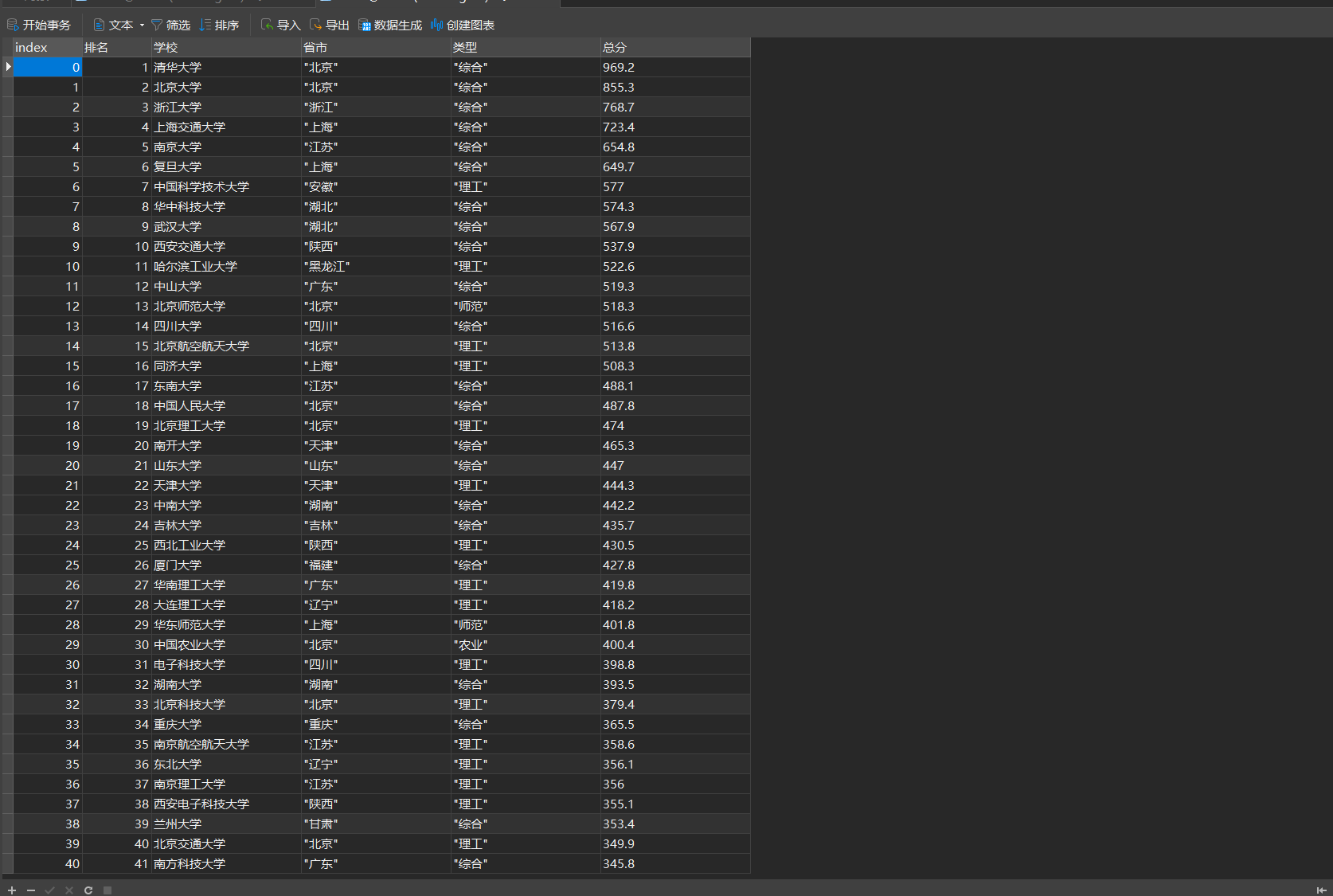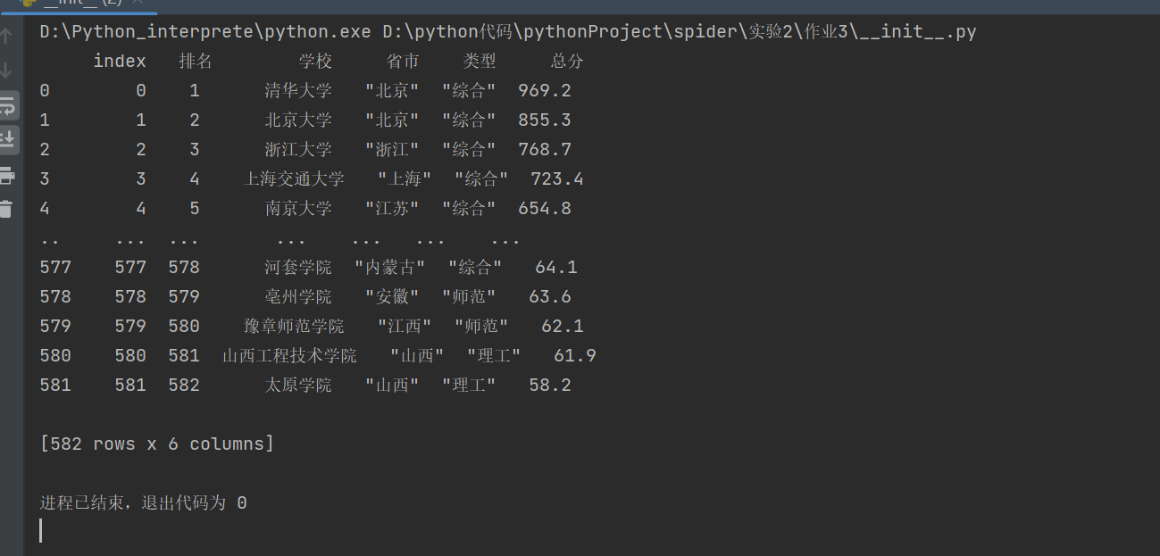 df = pd.DataFrame(columns=['排名', '学校', '省市', '类型', '总分'])