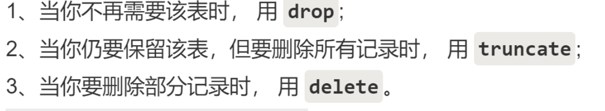 - 实测:使用 delete 删除数据后,新插入的数据主键 runoob_id 不会从1开始,而使用 truncate 清除表中数据后,新插入的数据主键 runoob_id 重新从1开始。