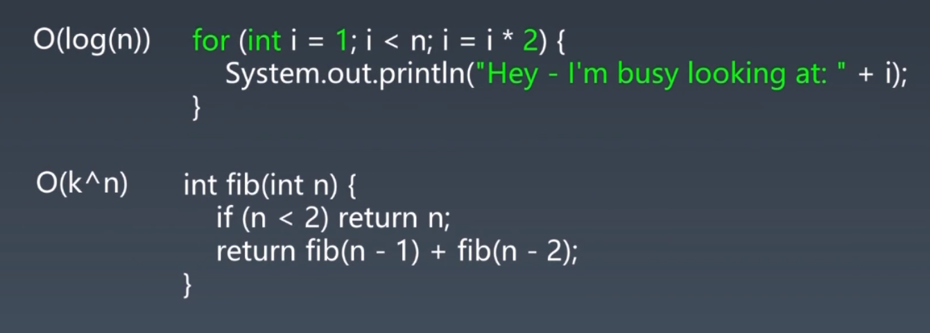 第一个:如果 n = 4,则执行2次,即永远会执行 $$log_2n$$ 次!所以时间复杂度为:O(logn)