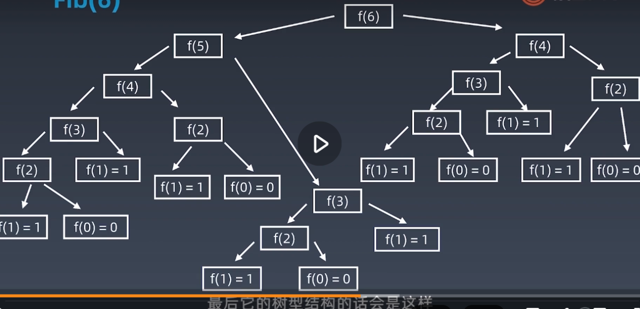 int fib(int n){ if (n < 2) return n; return fib(n-1) + fib(n-2); } // 时间复杂度;O(k^n) or O(2^n) // 一定不要这么写!!除非加上缓存中间结果,或者用循环来写最后的树形结构如下: