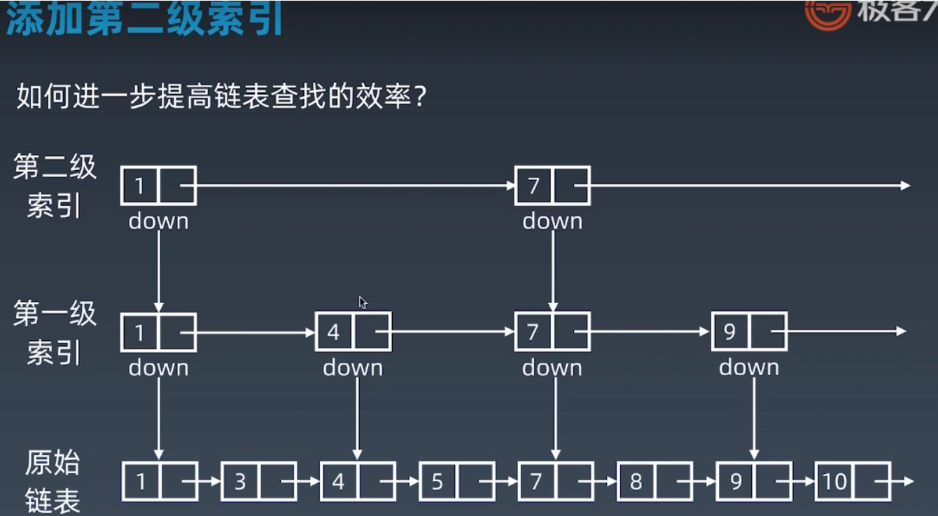 - 一维结构数据结构,如 链表,缺点查询O(n) -> 提出跳表,查询O(logn)