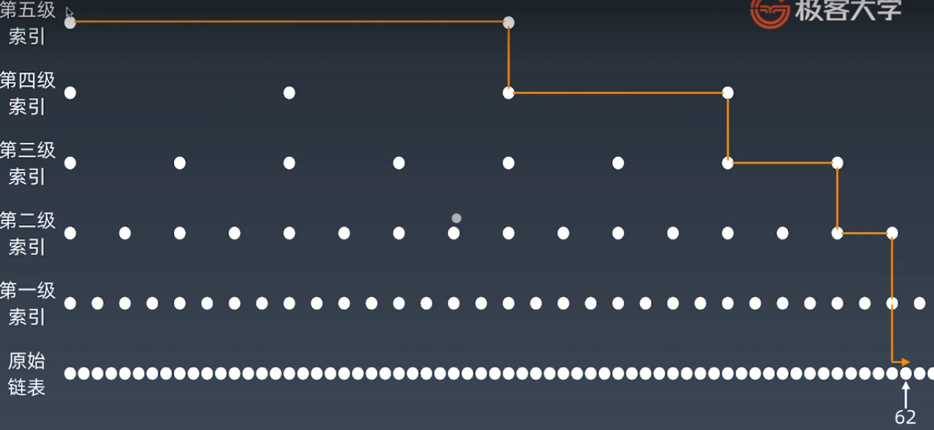 - 同时,维护成本相比链表更高,增加、删除元素也需要更新索引,所以时间复杂度上升为O(logn)