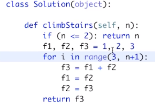 - 继续内存上优化递归:因为无需存所有的中间结果,只需存 i-1 和 i-2的结果,所以不再申请数组,而是申请两个中间变量!!!再加上第三个变量即可以递归!!所以空间复杂度为O(1),时间复杂度O(n)