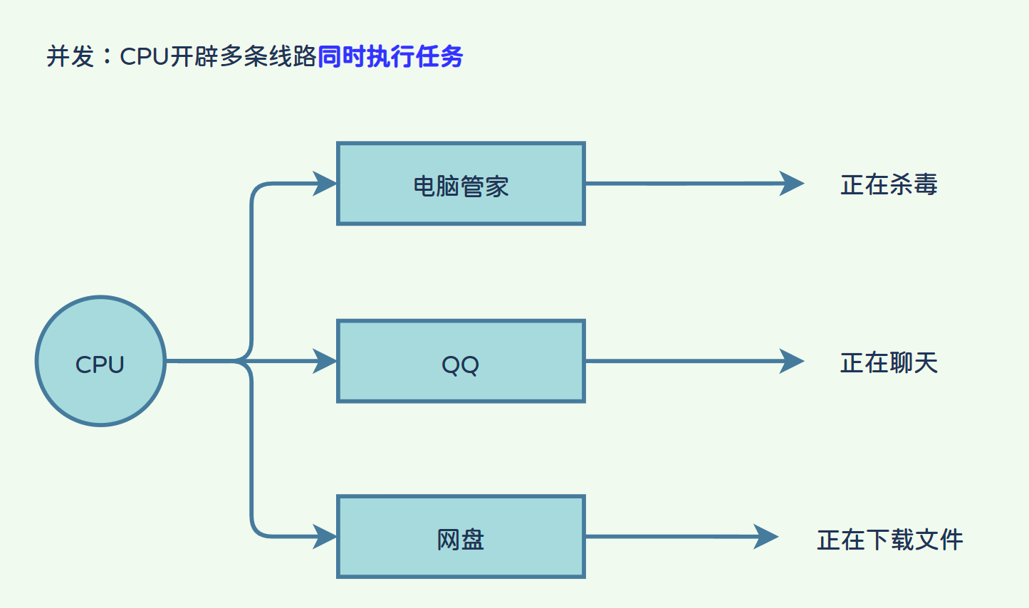 Tips:在上述案例中,不管是"烧水"还是"拍蒜"都是一个人(CPU核心)在操作多个器具(调度多个线程),如果出现了多个人来同时操作多个器具那就不属于并发的范畴了,而是属于并行;