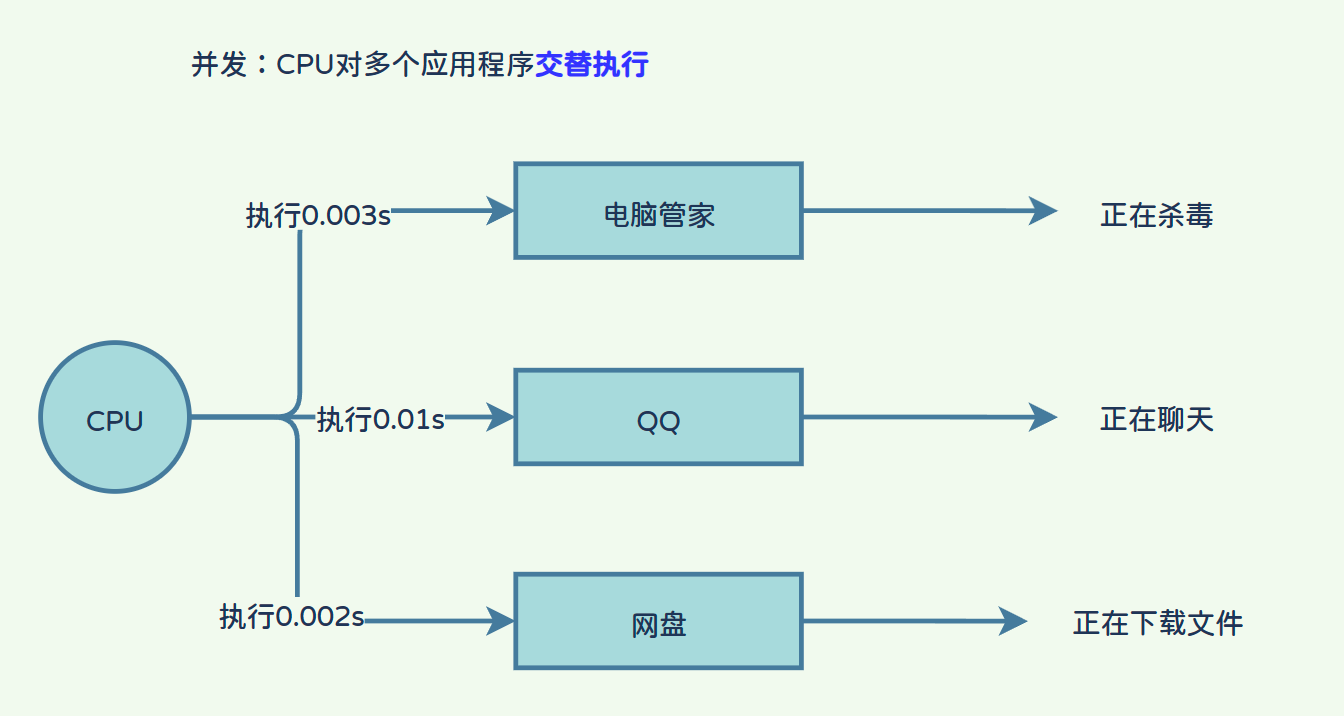 程序的并发指的是多个应用程序交替执行,CPU分配给每个应用程序一些“执行时间片”用于执行该应用程序,由于CPU的处理速度极快,并且分配个每个线程的“执行时间片”极短,给人们造成视觉上的误感,让人们以为是“同时”执行,其实是交替执行。