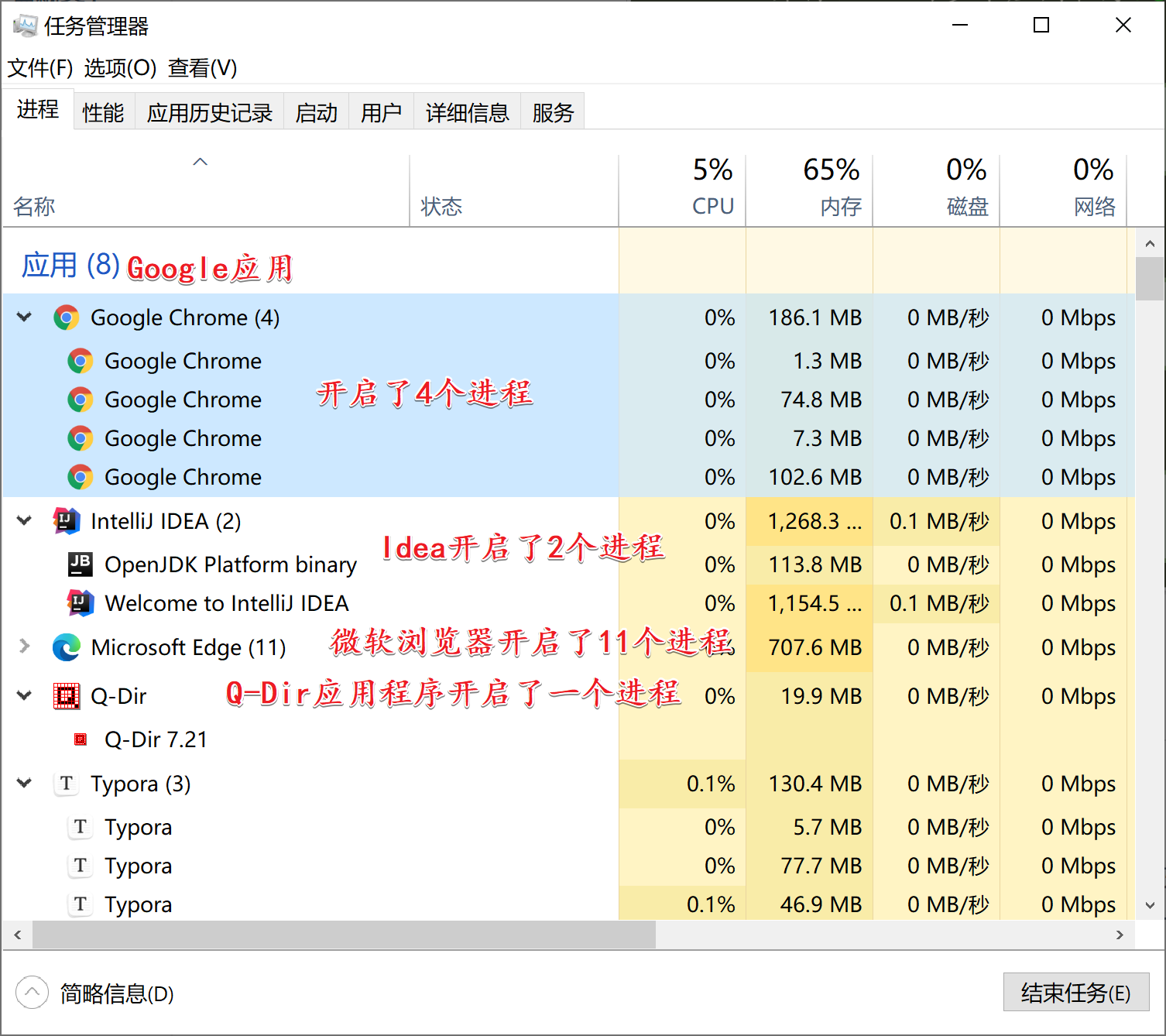 - 进程:是指一个内存中运行的应用程序,我们开启的应用如QQ、微信、google浏览器、idea开发工具等都是一个应用,一个应用最少具备一个进程,也有可能有多个进程,每个进程都有一个独立的内存空间,进程是系统运行程序的基本单位;