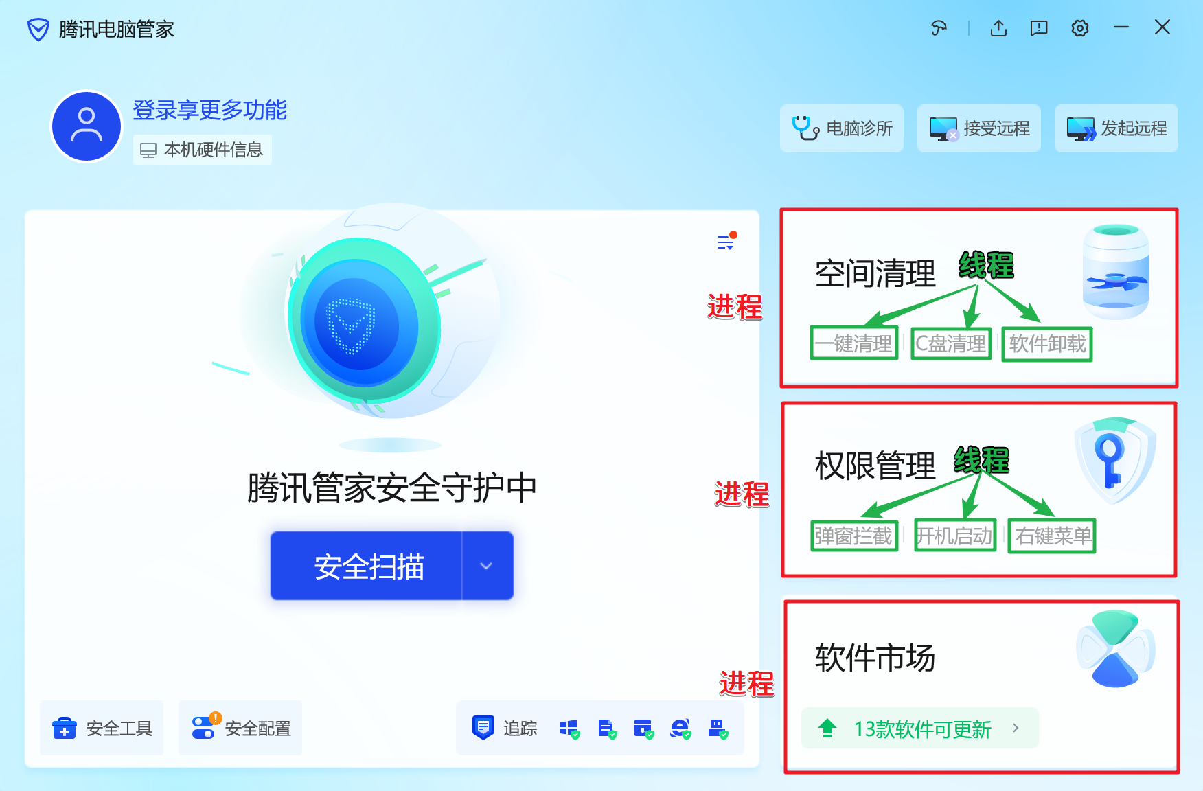 关于进程和线程的概念我们理解即可,上图中电脑管家的“首页体检”、“病毒查杀”等功能也有可能是一个进程来完成,关于病毒查杀功能下面可能还有其他小功能,有可能是线程完成,也有可能还是一个独立的进程来完成;