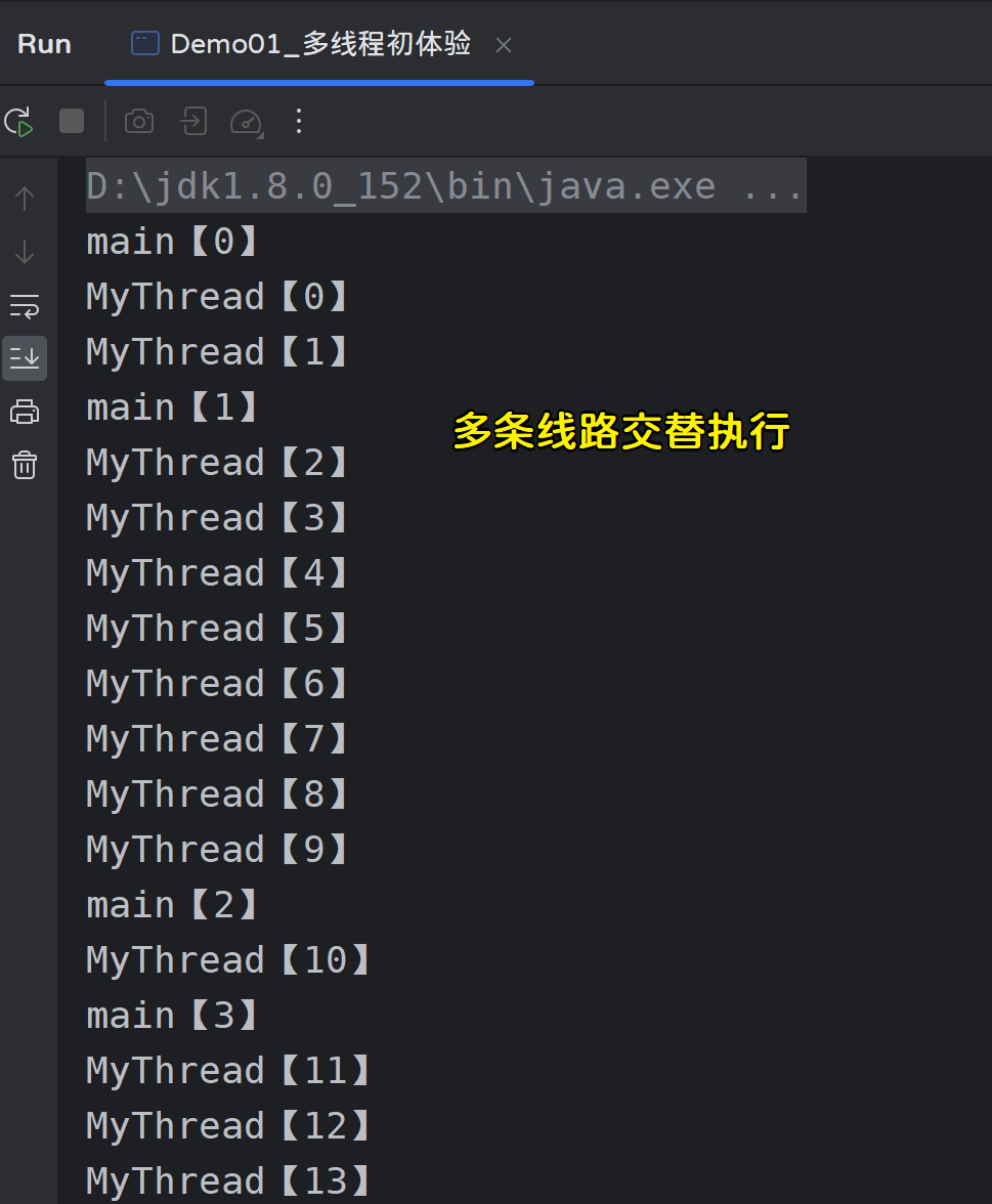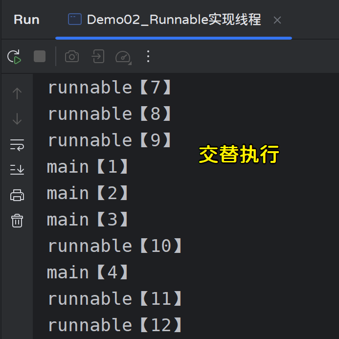 运行测试代码,观察是否交替执行;如果没有,可能是因为执行任务太少,CPU分配的一点点时间片就足以将线程中的任务全部执行完毕,可以扩大循环次数;观察效果;