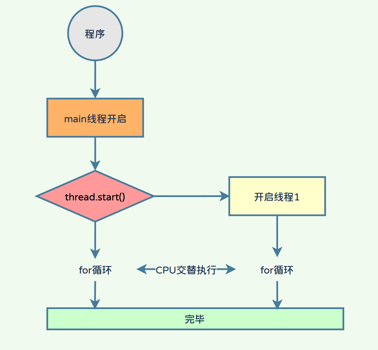 首先程序运行开启main线程执行代码,执行start()方法时开启一条新的线程来执行任务,新的线程与main线程争夺CPU的执行权在交替执行;