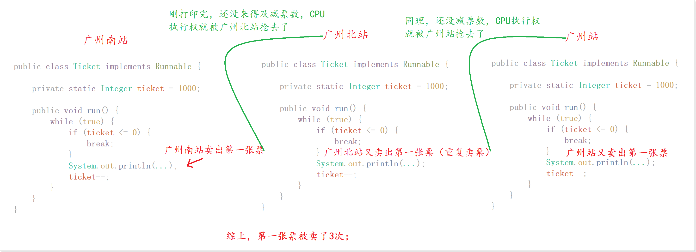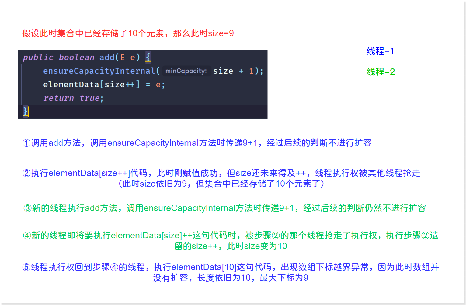 ②等待代码将集合的9下标赋值后,size++还没来得及运算,CPU的执行权就被其他的线程抢走了,此时size仍旧为9,但此时集合中已经存储了10个元素了;