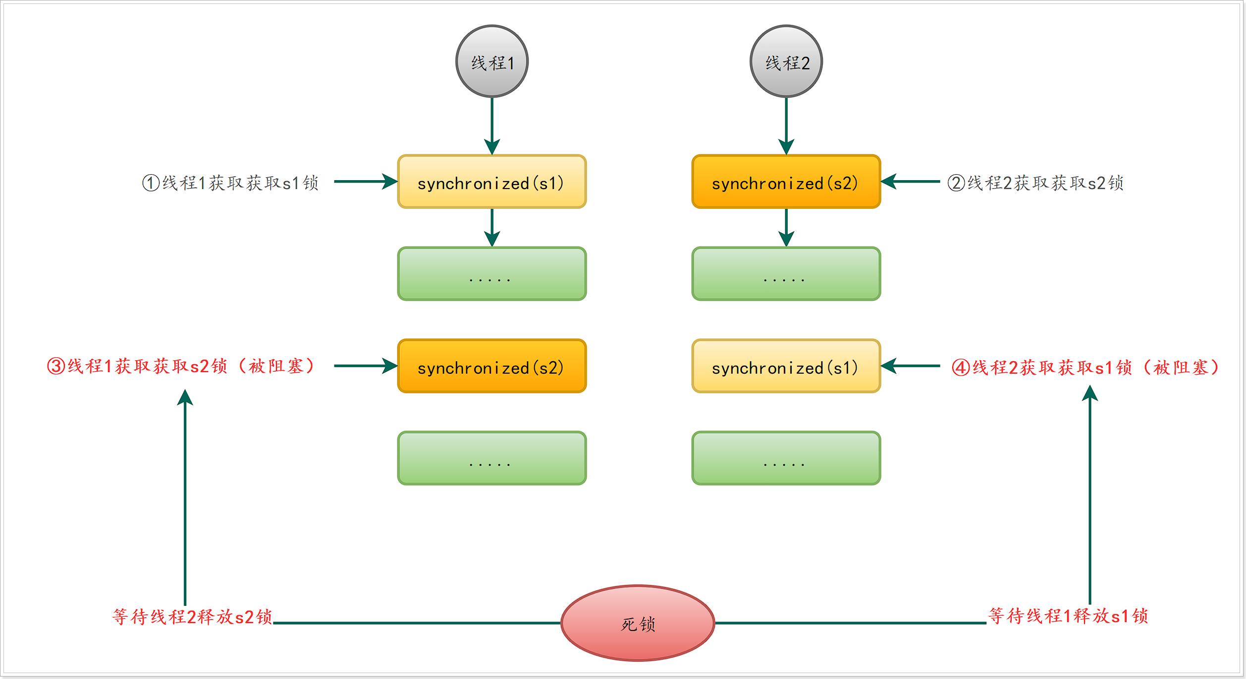 synchronized (s1) { // ④线程2继续执行,被锁阻塞(死锁)