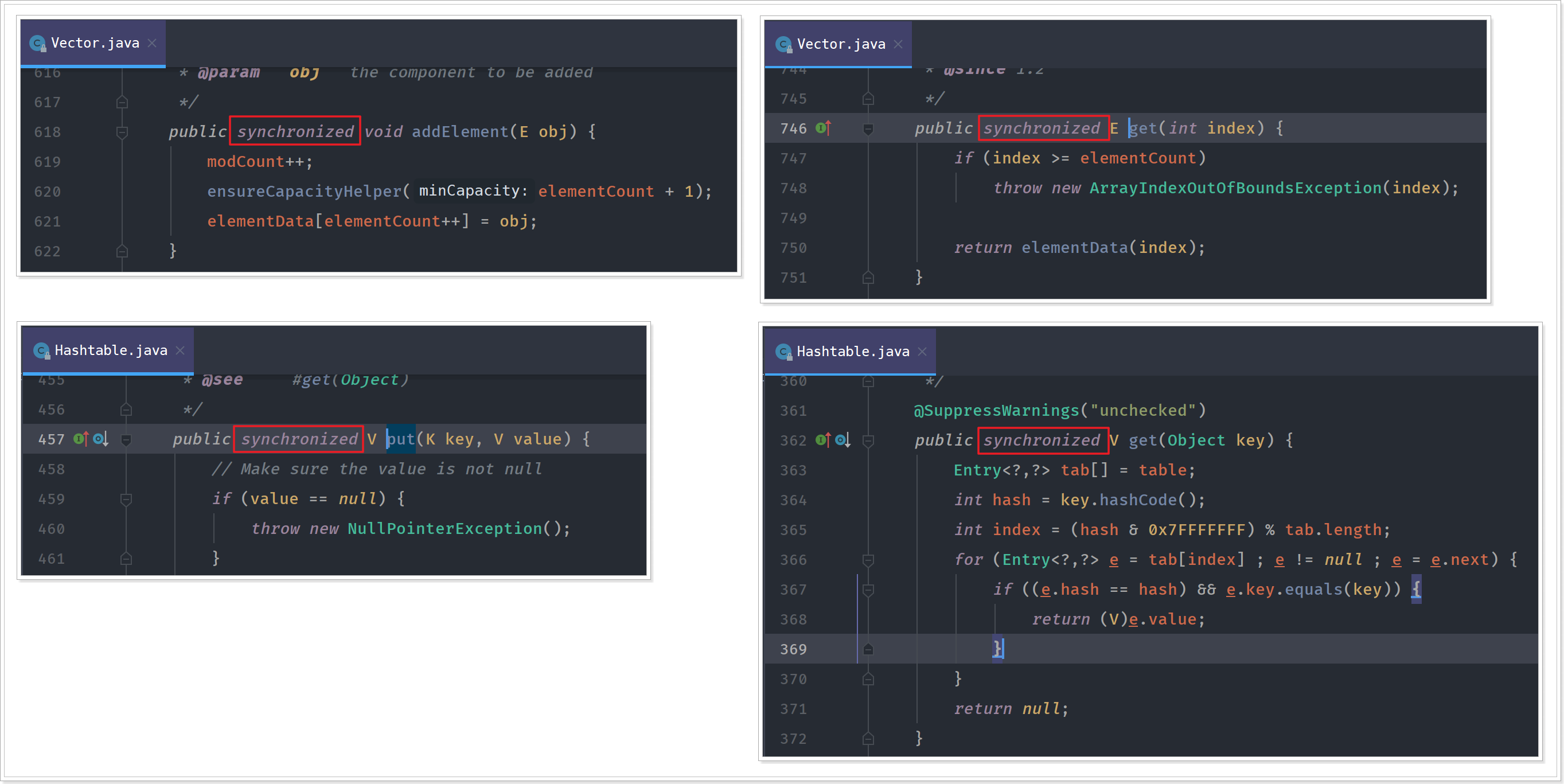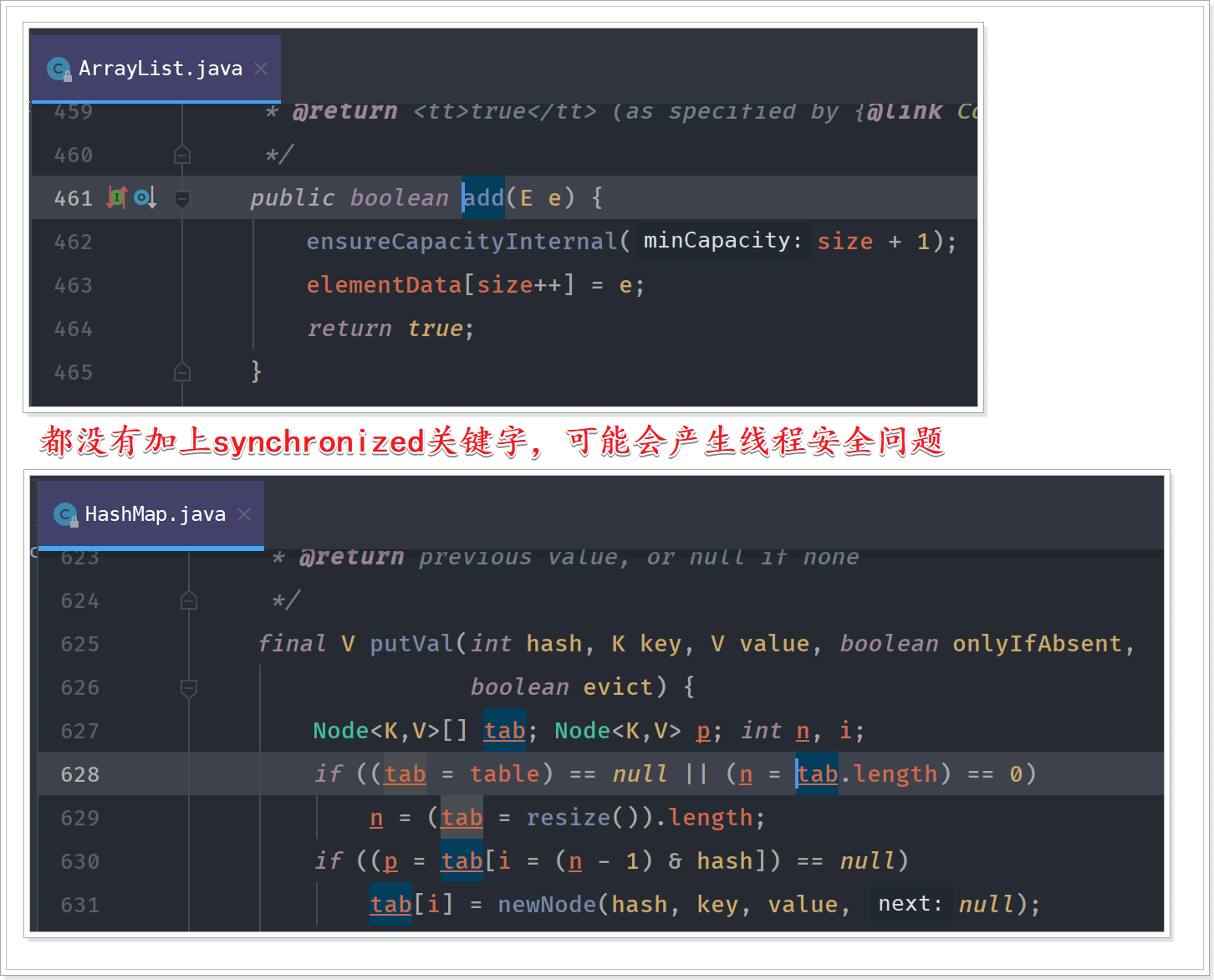 线程安全集合中的方法大部分都加上了synchronized关键字来保证线程的同步;