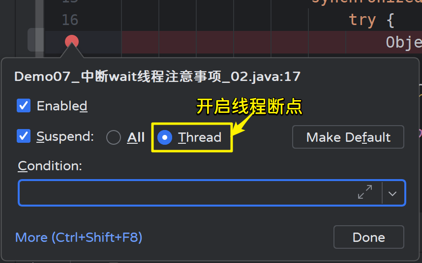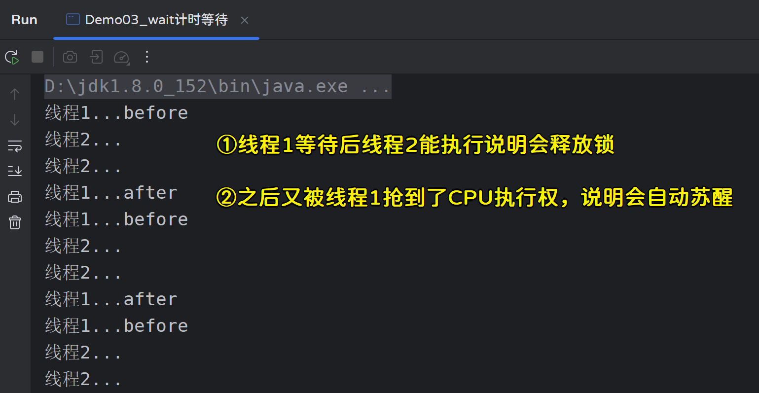 如果调用wait的无参方法,那么线程将会一直等待下去,直到期间有其他线程来将其唤醒(notify);但wait方法也支持自动苏醒,我们可以传递一个时间片,让其等待指定的时间后苏醒过来;