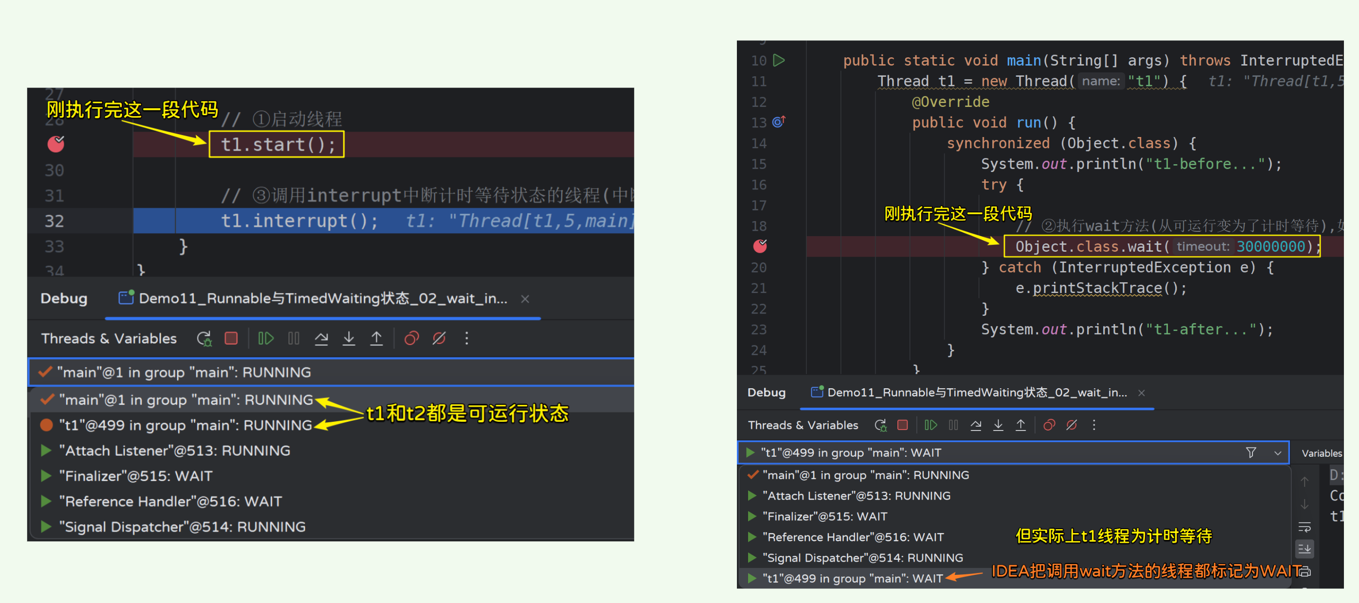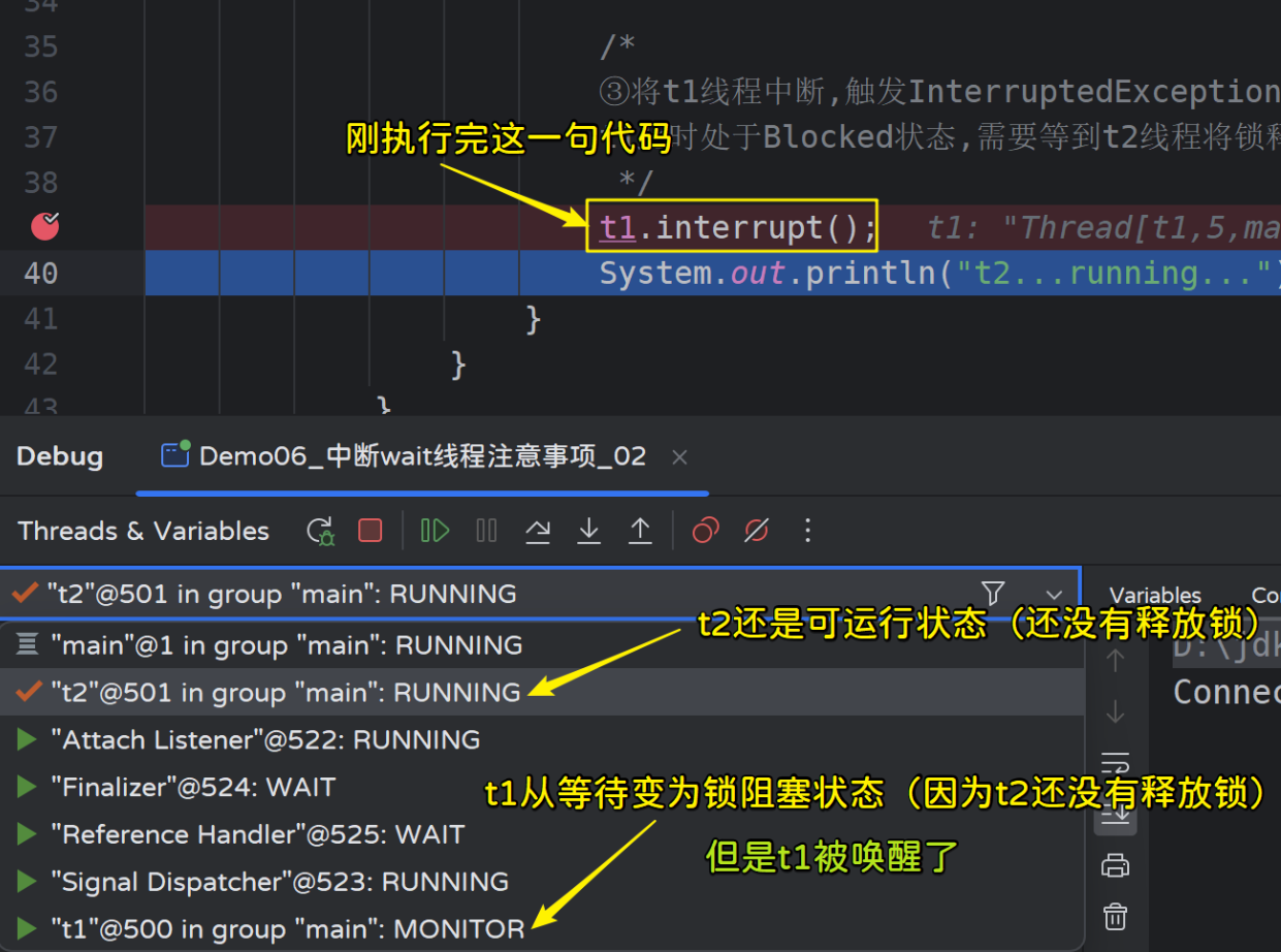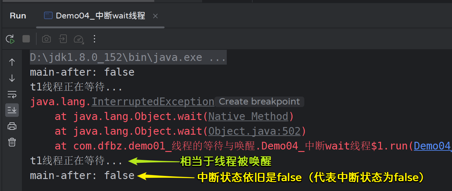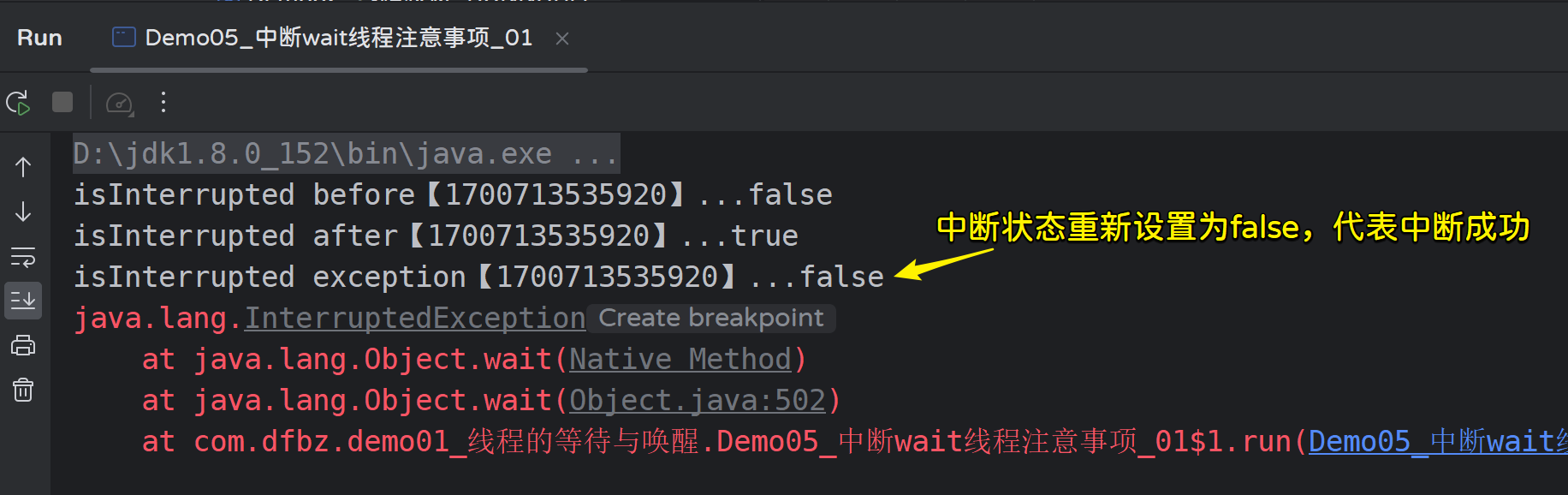 通过线程对象的interrupt()方法可以将当前线程中断(中断状态设置为true),但如果当前线程处于wait状态,则中断线程触发异常,相当于中断失败,中断状态依旧为false。
