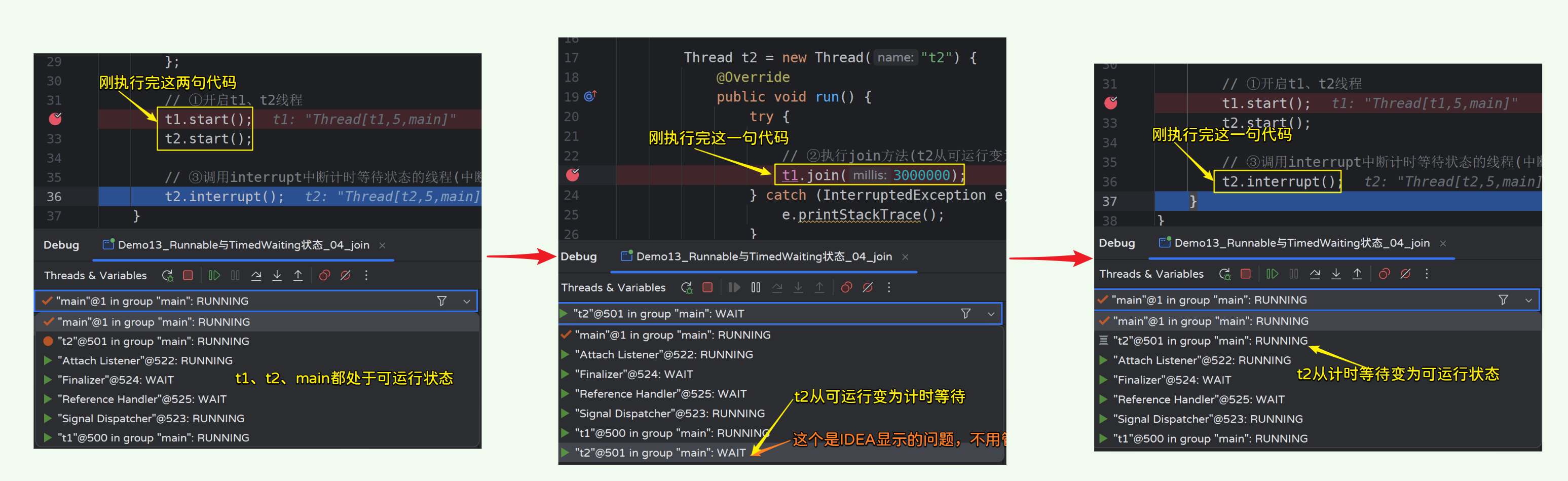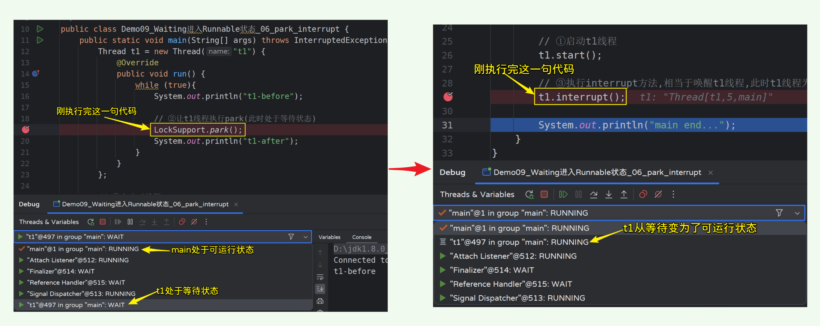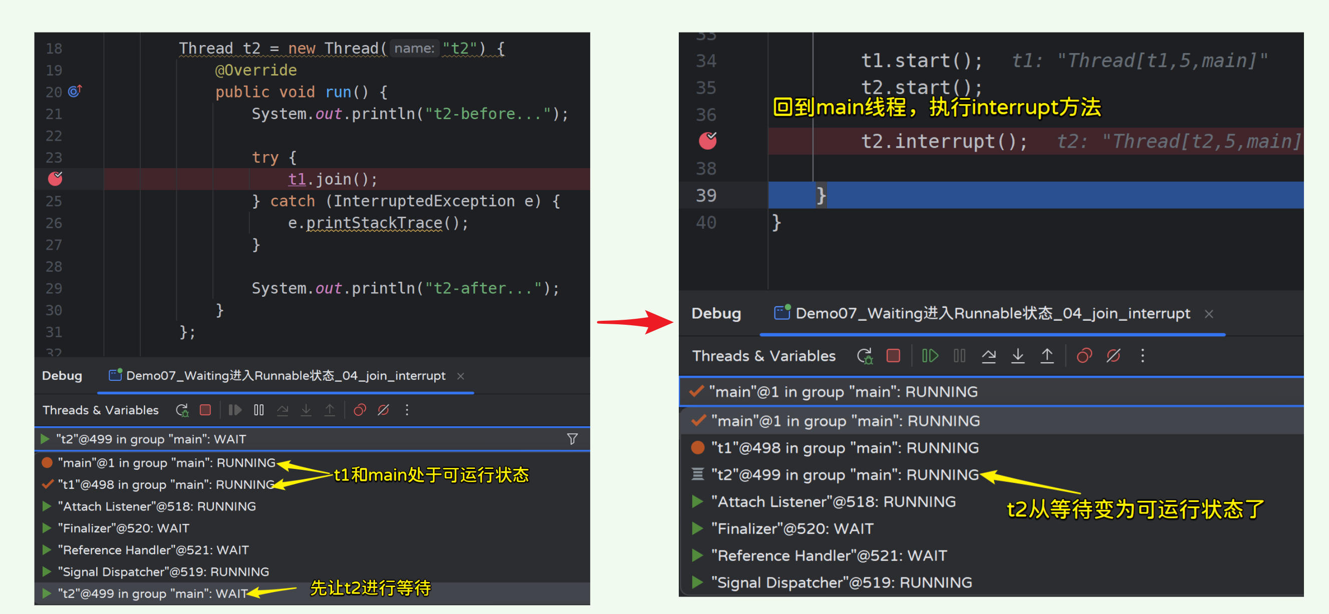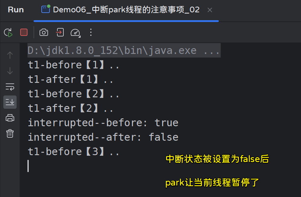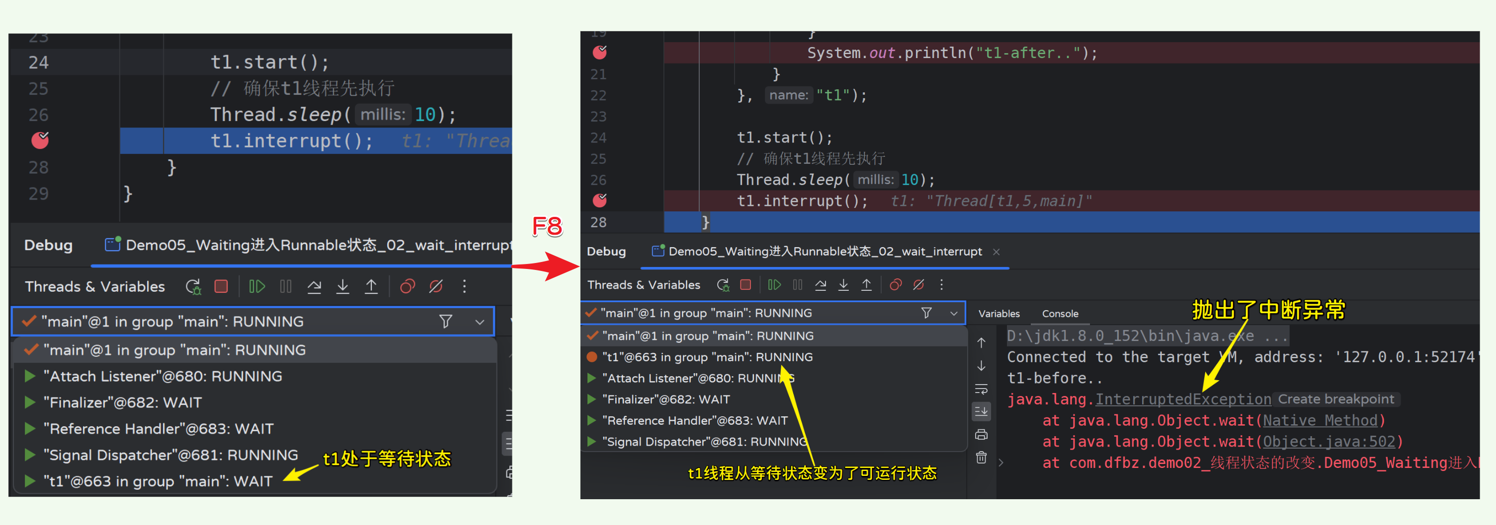 通过线程对象的interrupt()方法可以将当前线程中断(中断状态设置为true),但如果当前线程处于wait状态,则中断线程触发异常,相当于中断失败,中断状态依旧为false。
