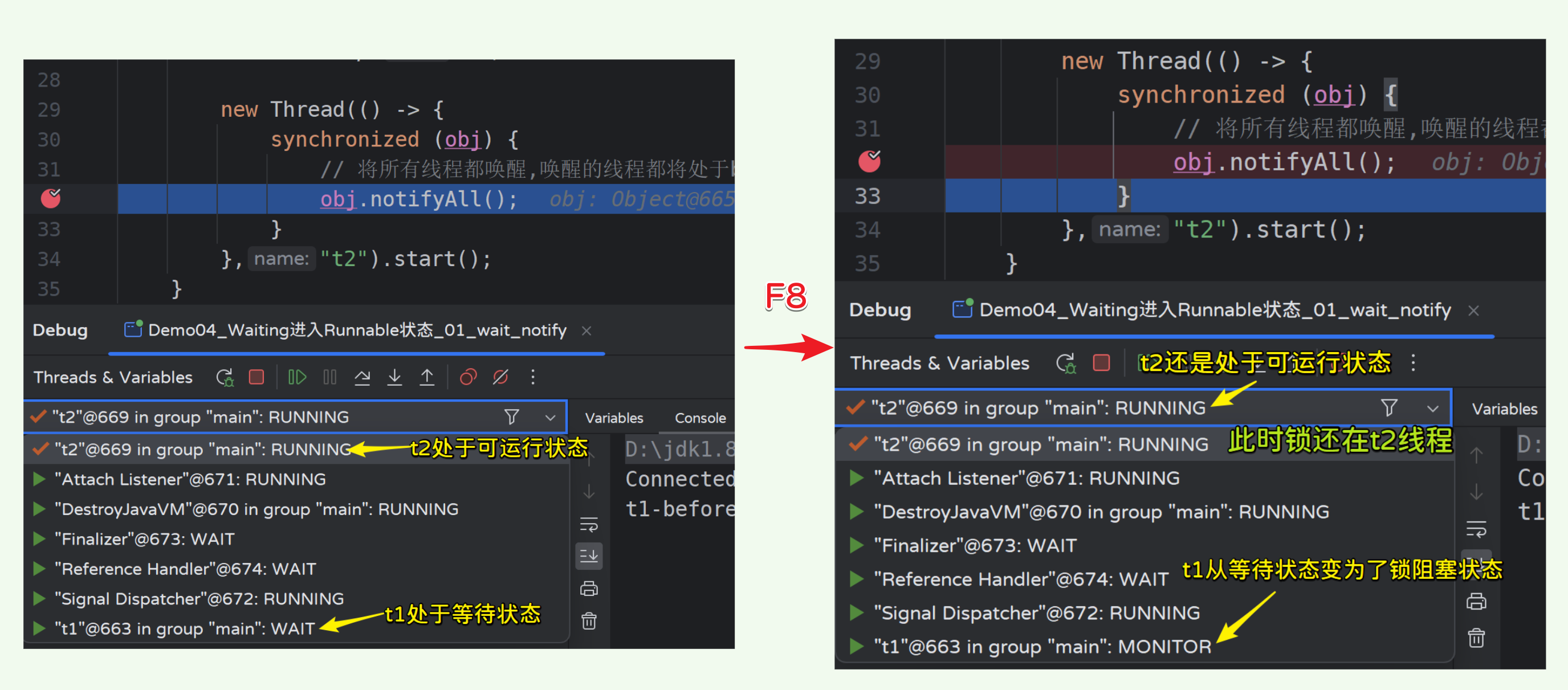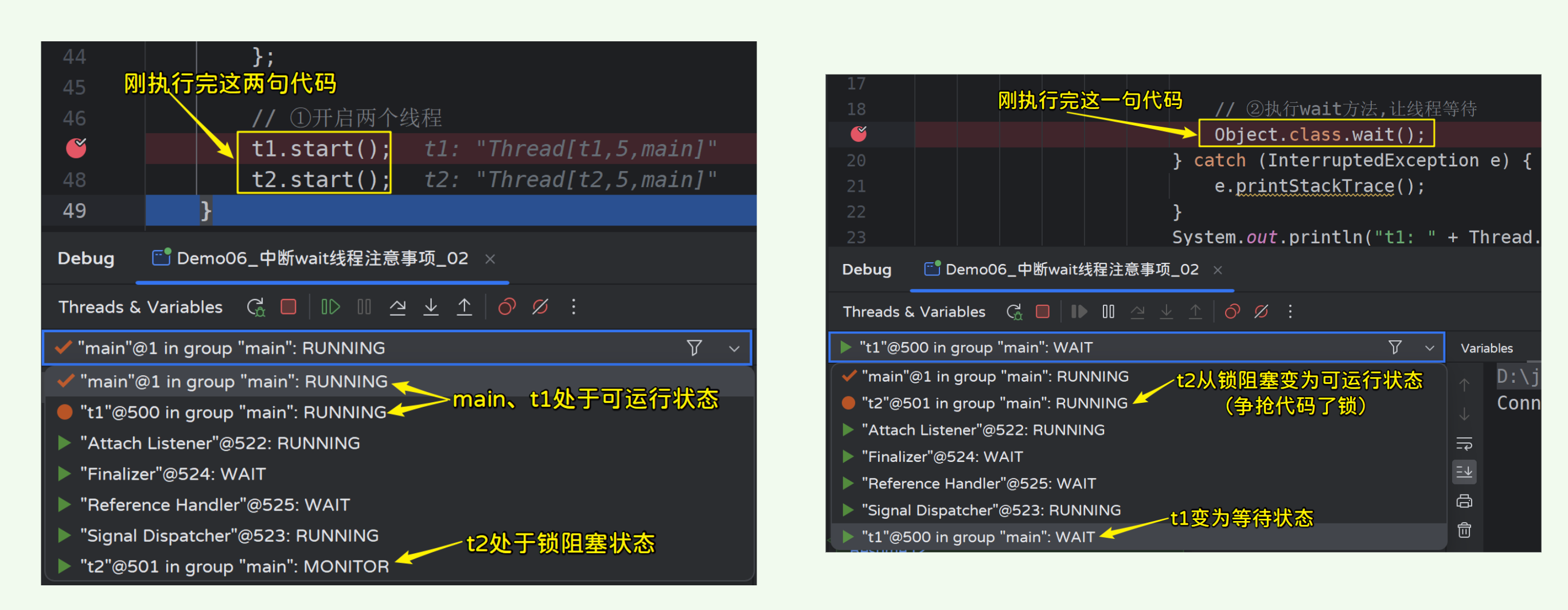 - 1)wait方法与notify方法必须要由同一个锁对象调用。因为:wait方法正是用来让当前锁对象对应的这条线程等待,notfiy方法正是用来唤醒某个锁对应的多条线程中的随机一条,wait方法和notify方法必须由同一个锁对象调用
