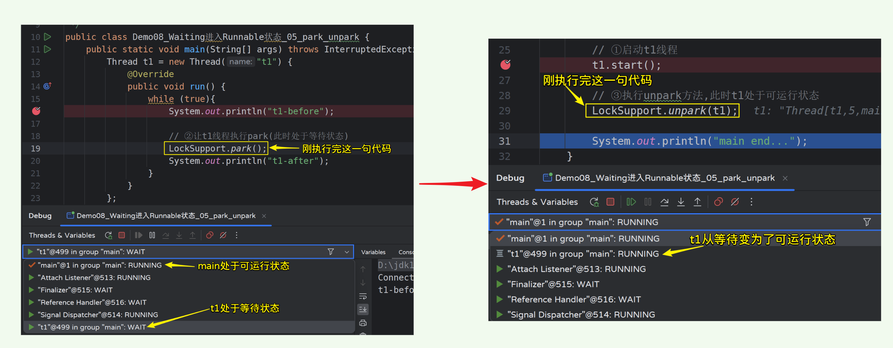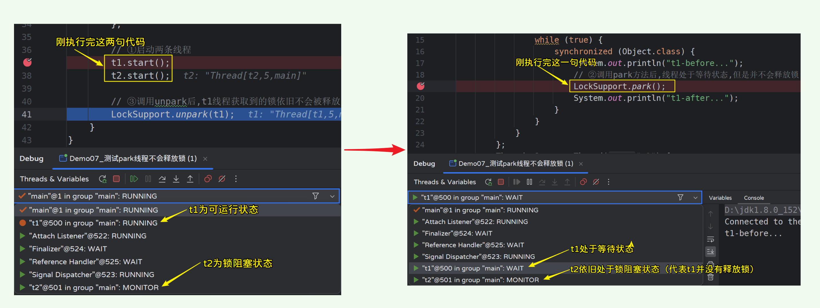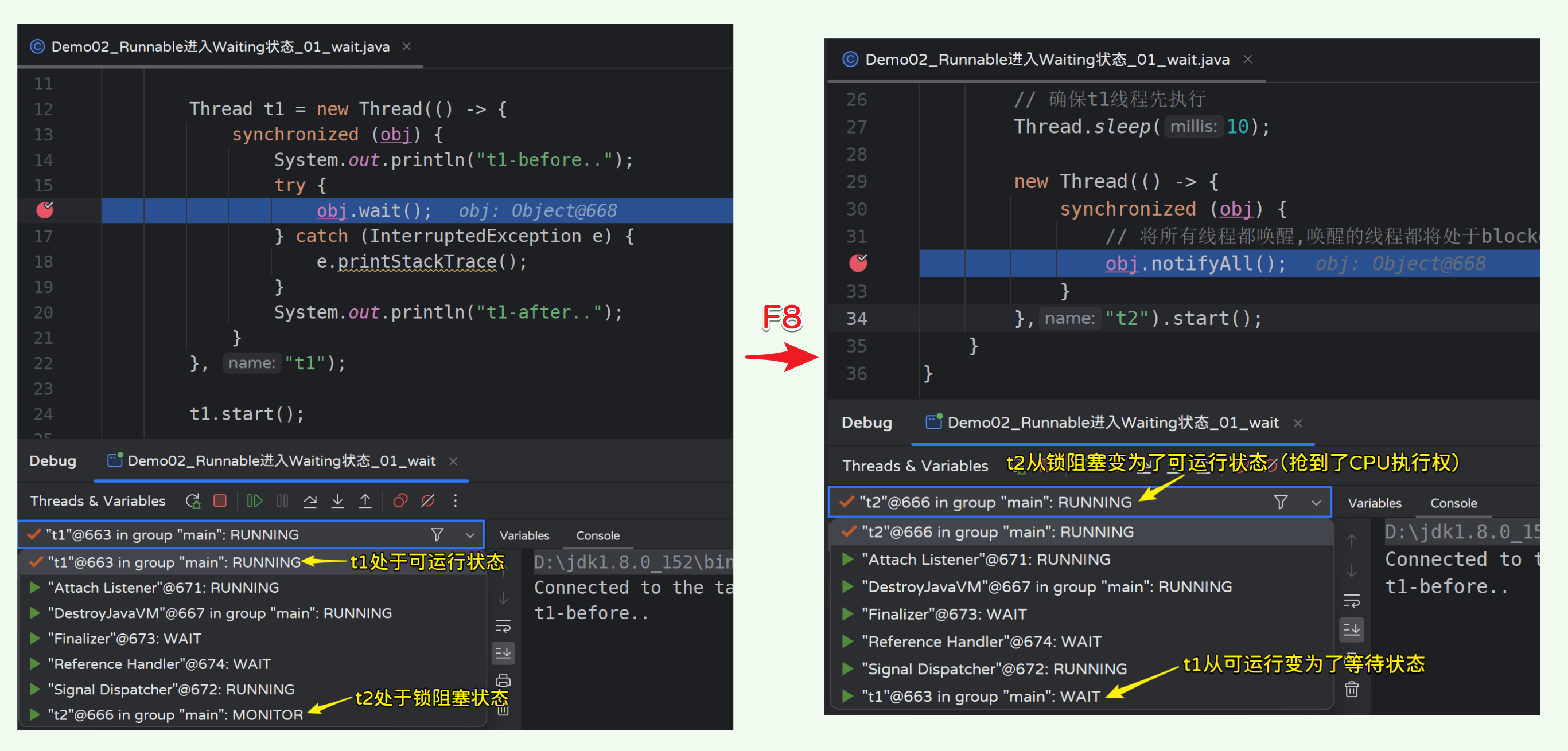 Tips:wait方法是锁对象来调用,调用wait()之后当前线程将释放当前锁,并且让当前锁对象对应的线程处于等待(Waiting)状态,如果没有其他线程来唤醒,那么被wait()方法等待的线程将会一直等待下去;