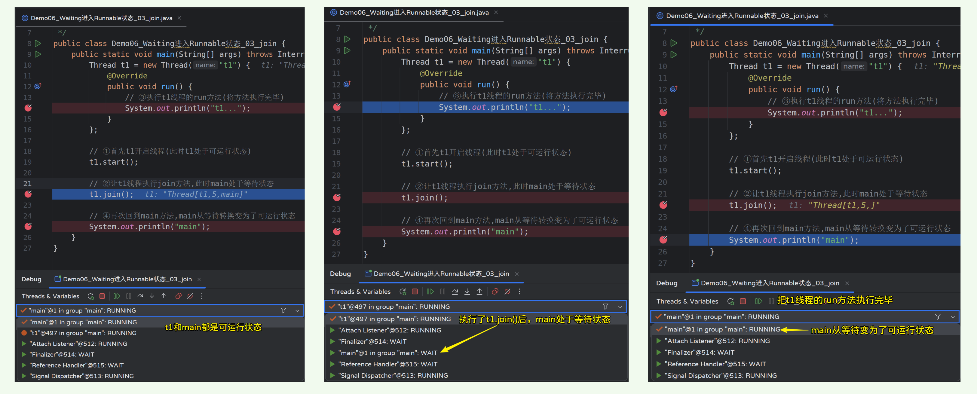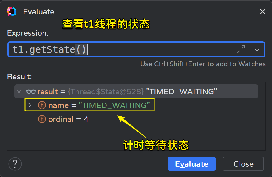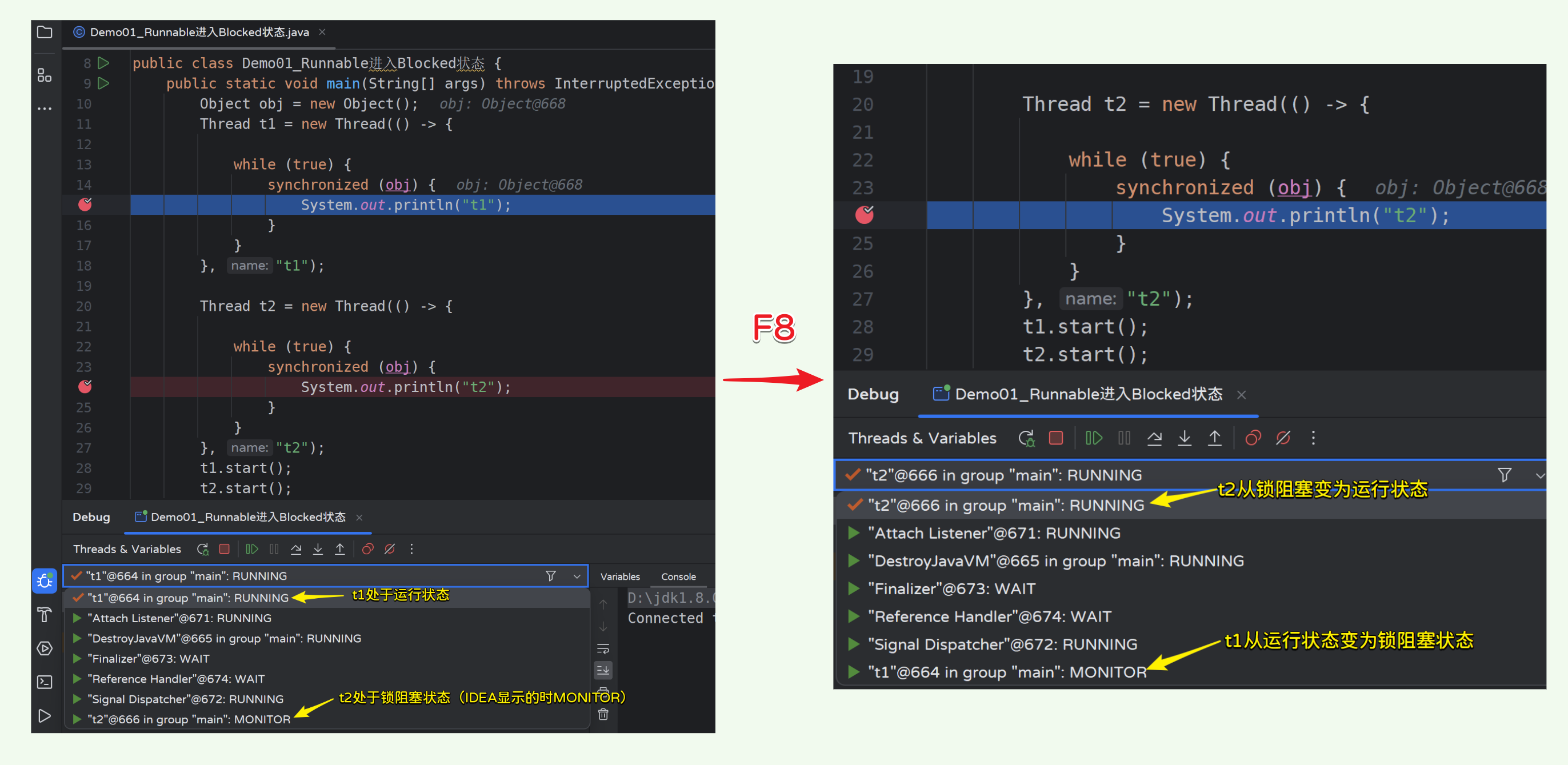 Tips:wait方法是锁对象来调用,调用wait()之后当前线程将释放当前锁,并且让当前锁对象对应的线程处于等待(Waiting)状态,如果没有其他线程来唤醒,那么被wait()方法等待的线程将会一直等待下去;