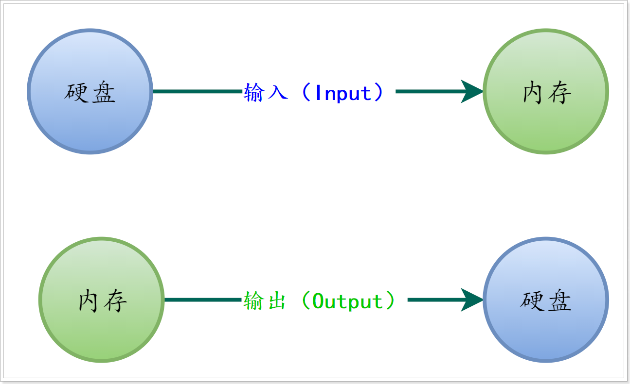 I(Input)O(Output):中文翻译为输入输出,我们知道计算机的数据不管是软件、视频、音乐、游戏等最终都是存储在硬盘中的,当我们打开后,由CPU将硬盘中的数据读取到内存中来运行。这样一个过程就产生了I/O(输入/输出)