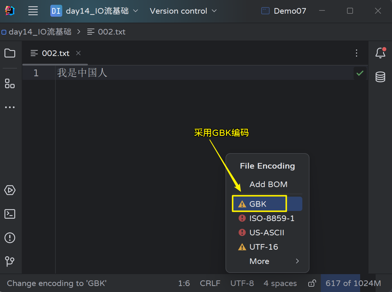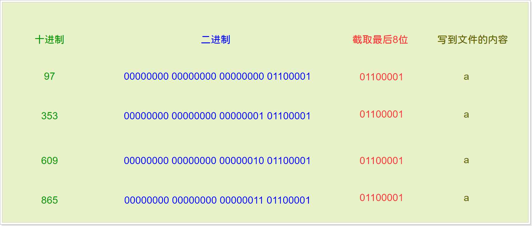 Tips:使用字节流向文件写出数据时,首先只会截取一个字节大小,然后根据ASCII码表进行对应字符的转换。