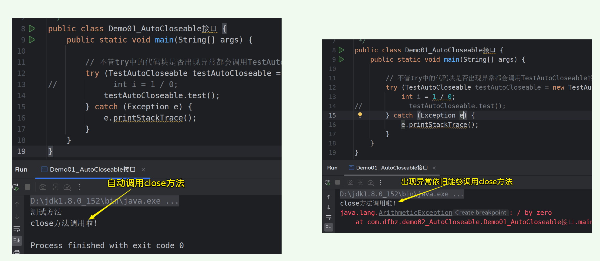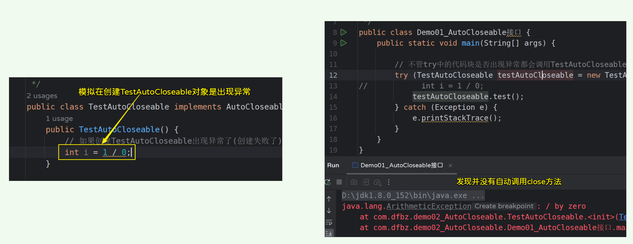 // 不管try中的代码块是否出现异常都会调用TestAutoCloseable的close方法,除非TestAutoCloseable创建的时候出现异常了(创建失败了)