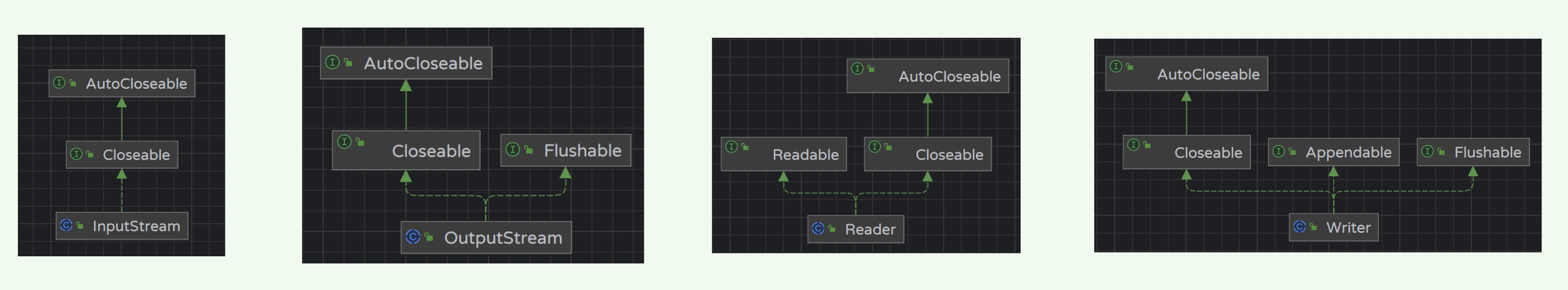 我们可以看到四个父接口都继承了AutoCloseable,也就是说Java中的所有流都实现了AutoCloseable接口: