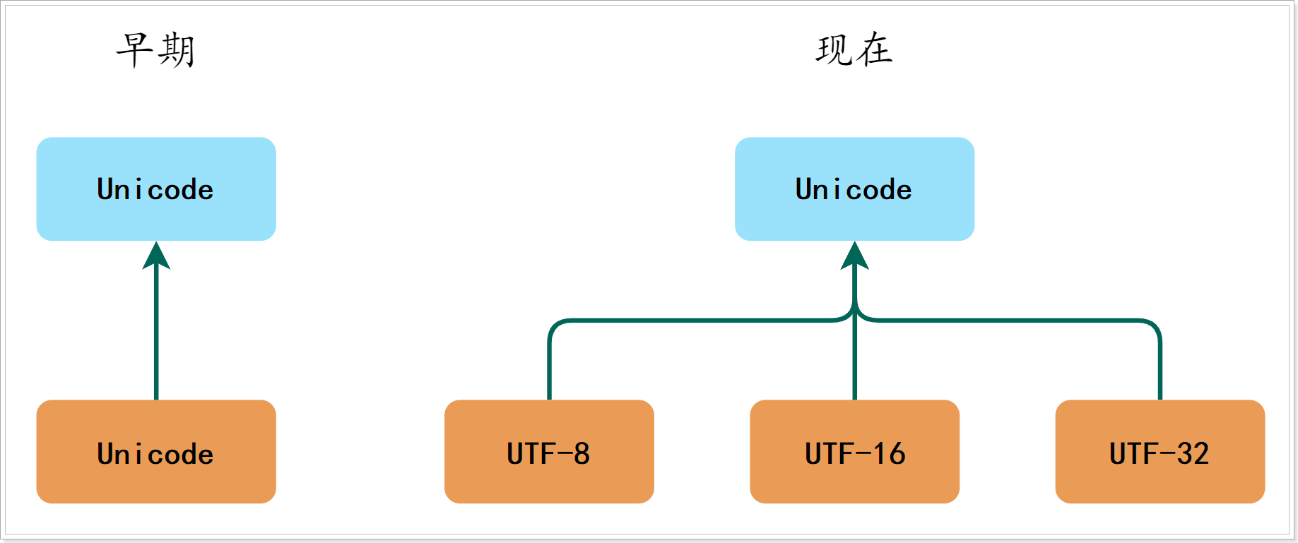 到了 Unicode,变得不一样了,唯一的 Unicode 字符集对应了三种编码:UTF-8,UTF-16,UTF-32。字符集和编码等概念被彻底分离且模块化,其实是 Unicode 时代才得到广泛认同的。