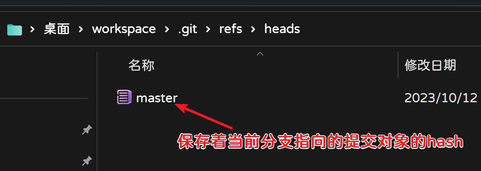 在Git中,分支其实本质上仅仅是指向Commit对象的可变指针;默认情况下所有仓库都会有一个默认的分支,名为master。在.git\refs\heads目录存储着当前仓库的所有分支。每一个分支都有一个以分支名命名的文件,该文件存储着当前分支指向的提交对象的hash值;