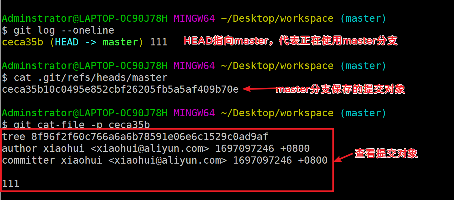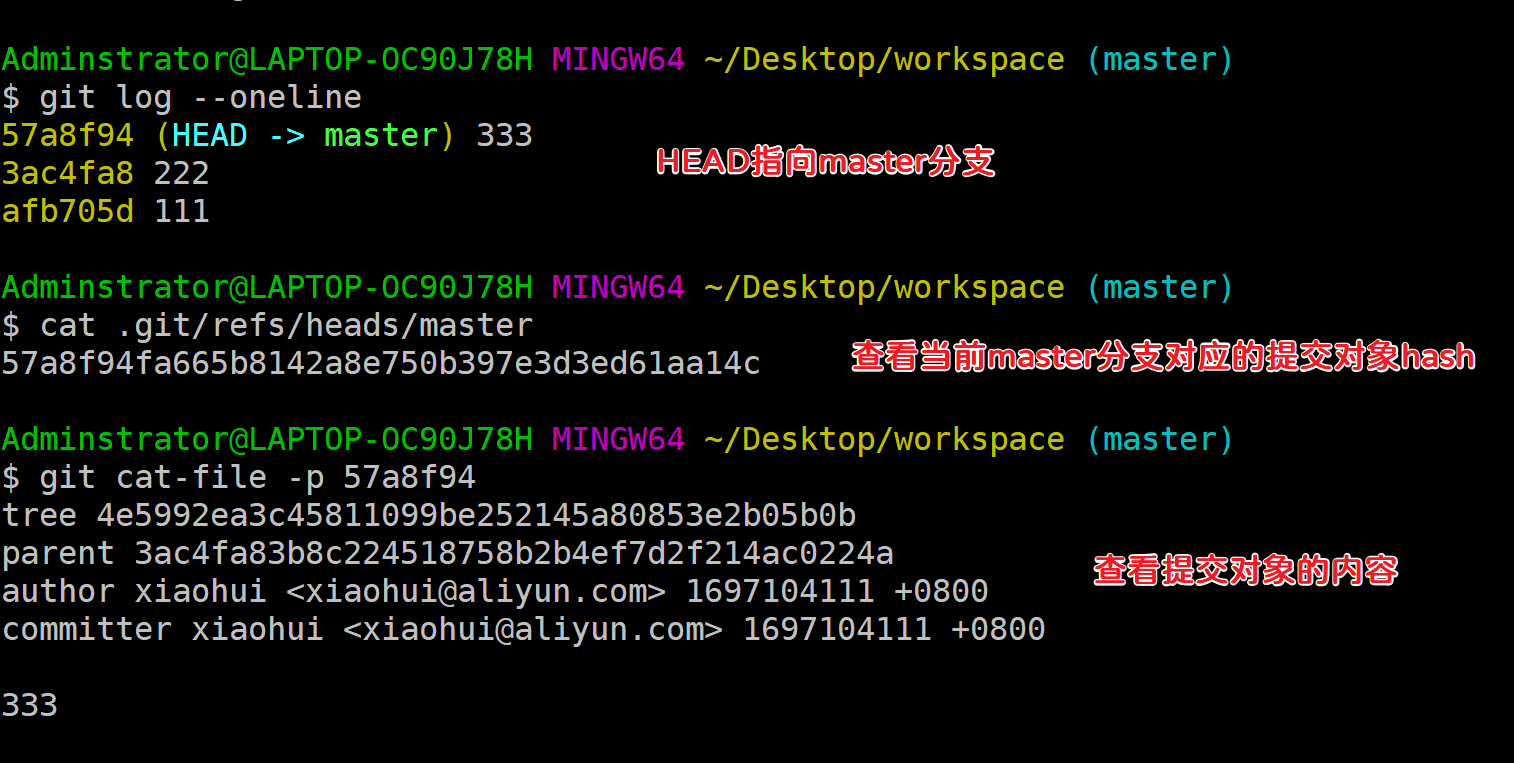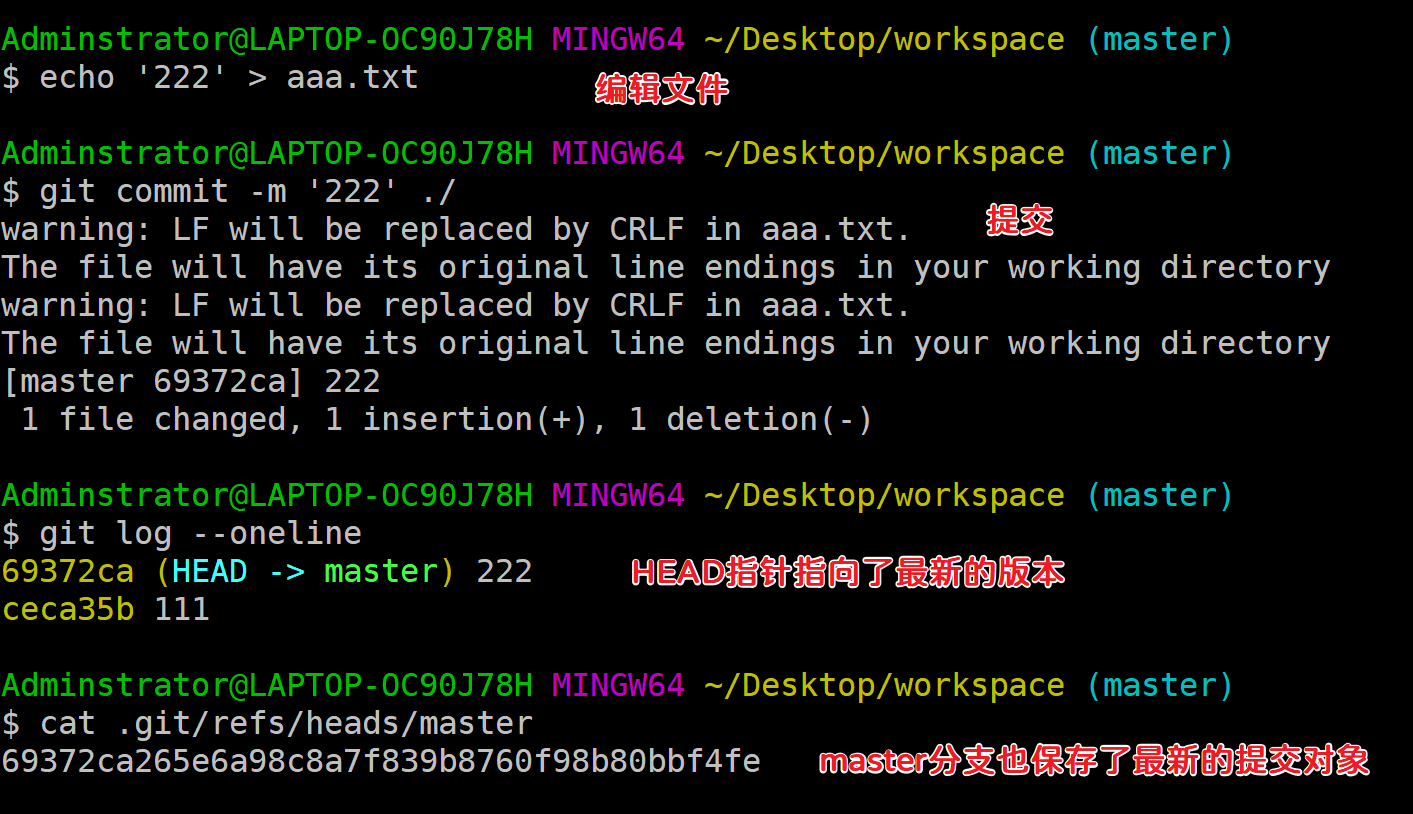 Adminstrator@LAPTOP-OC90J78H MINGW64 ~/Desktop/workspace (master) # 提交