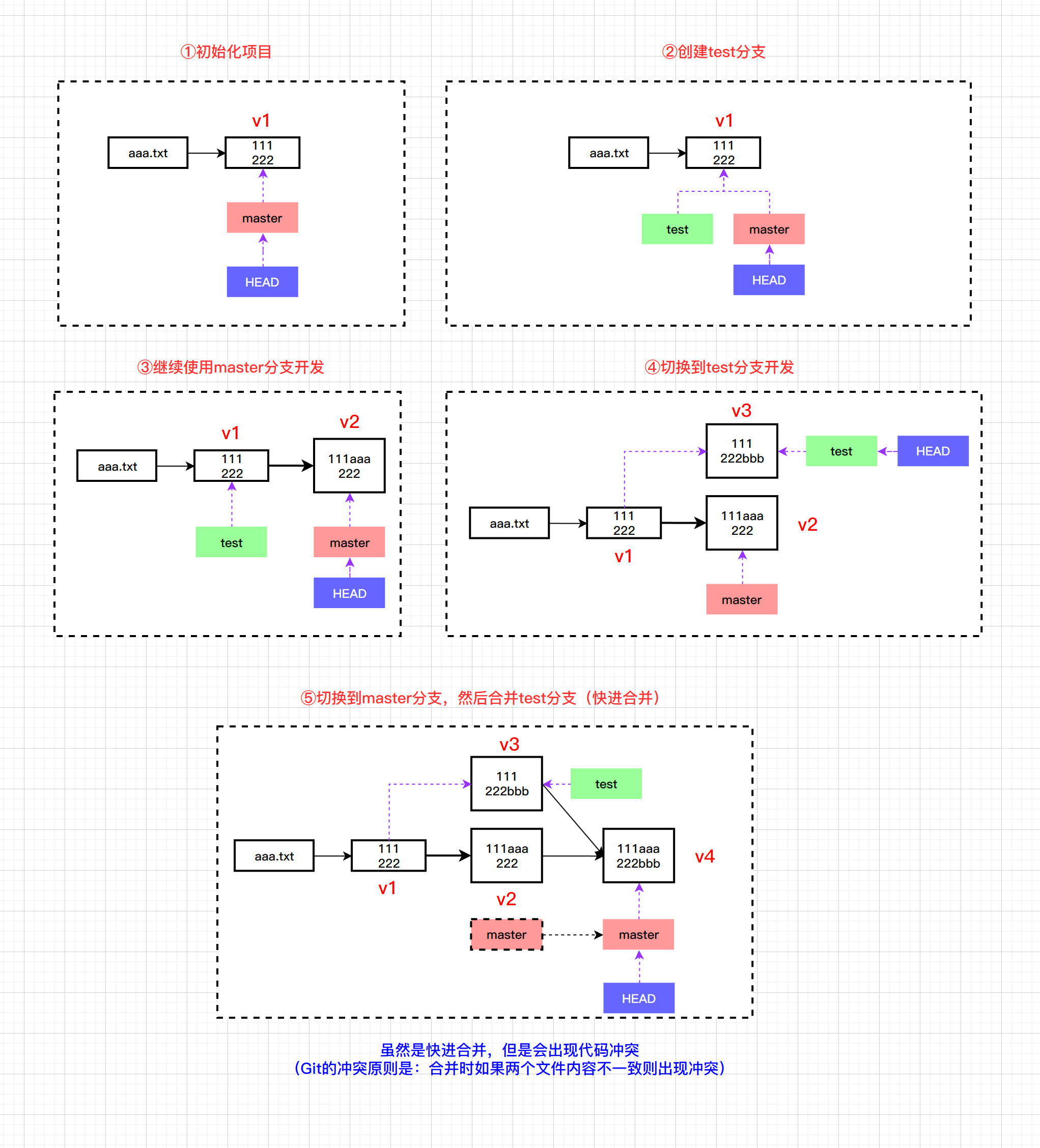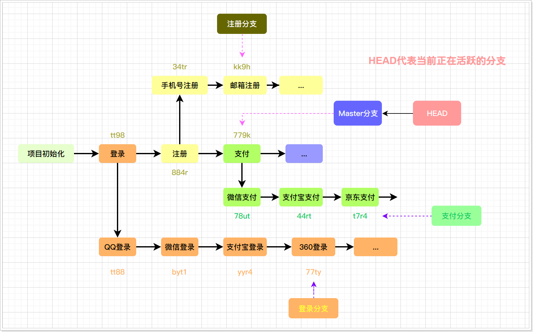 - 在Git中,每一个分支都是保存一个提交对象的hash值: